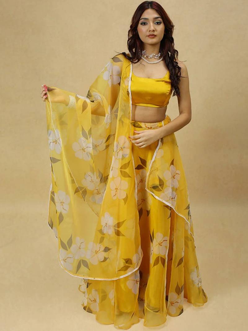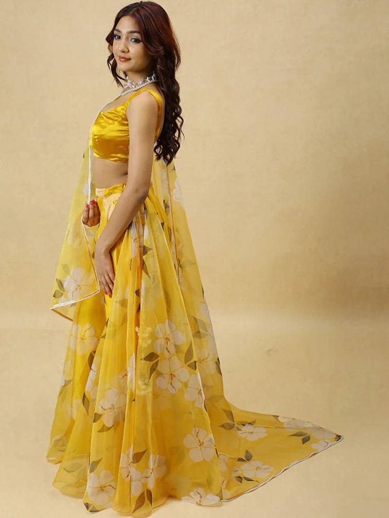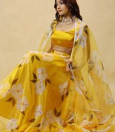 Printed organza semi stitched lehenga & ready to wear blouse with dupatta free size upto 42