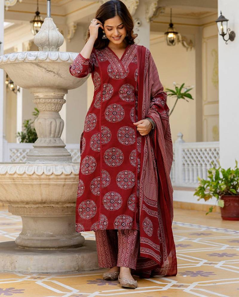 | Product Description | Maroon Printed Kurta With Palazzos With Dupatta Kurta Design: |