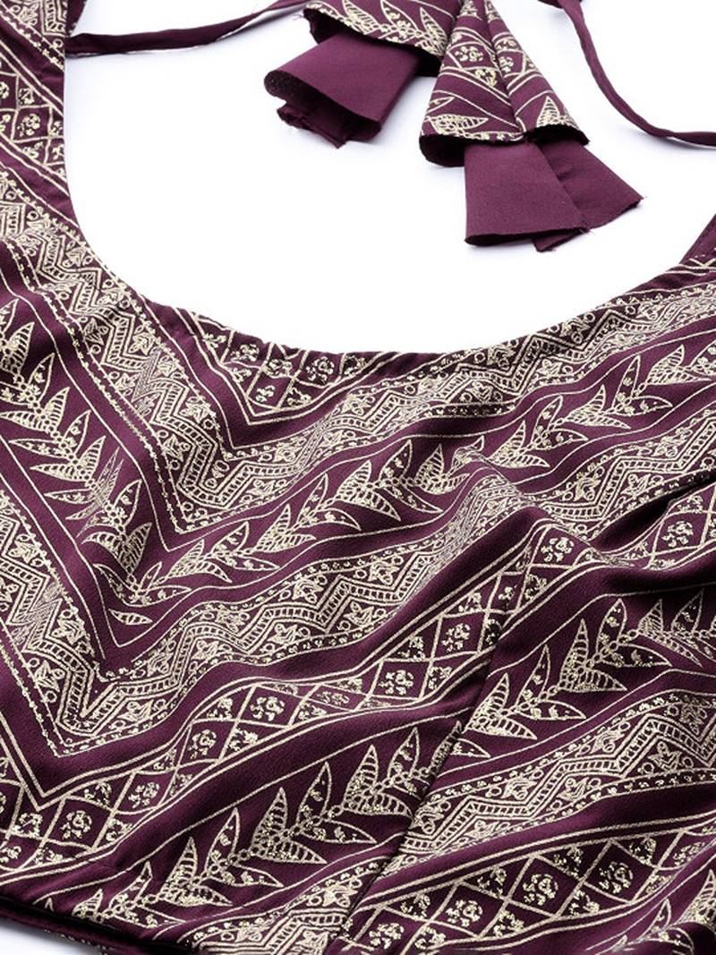 Purple & gold-toned printed sequinned foil print ready to wear lehenga & blouse with dupatta free size upto 42