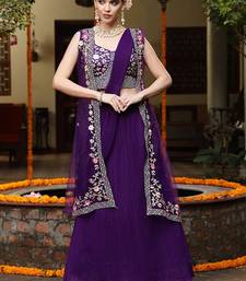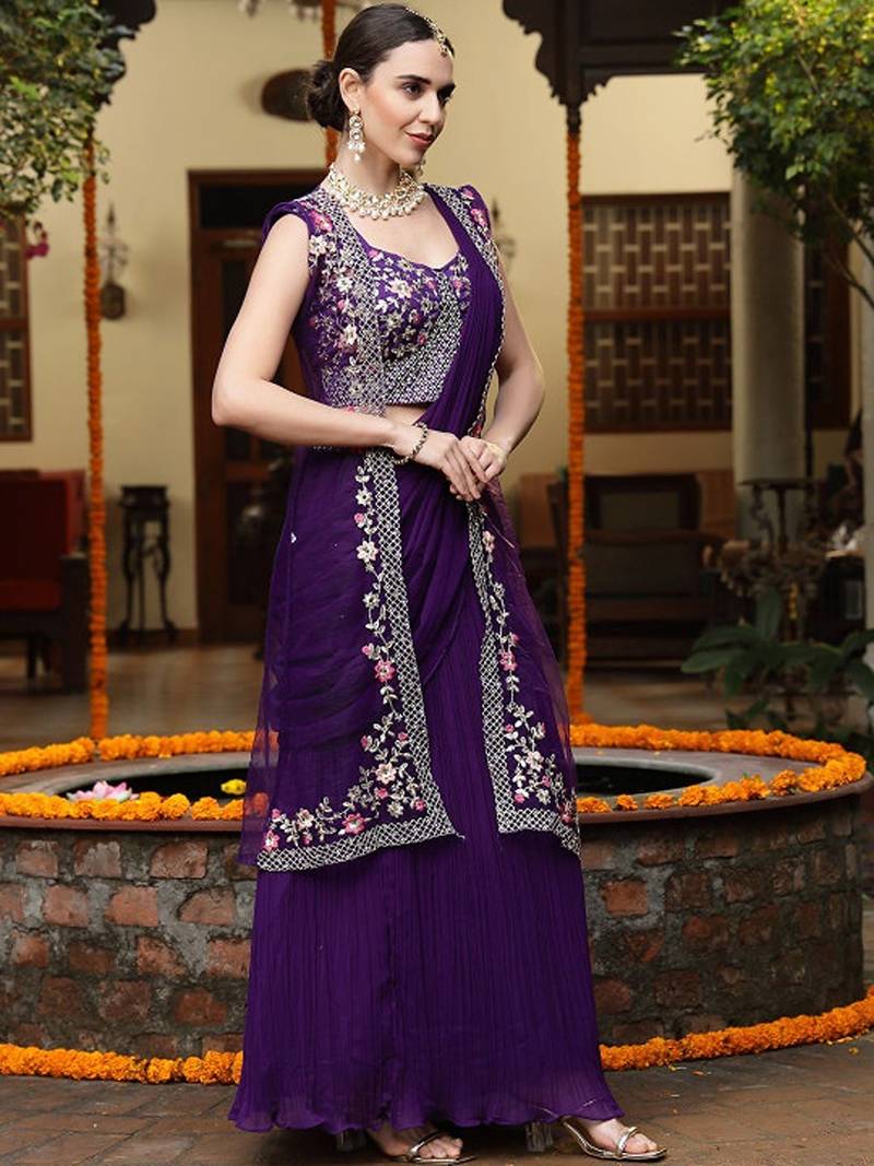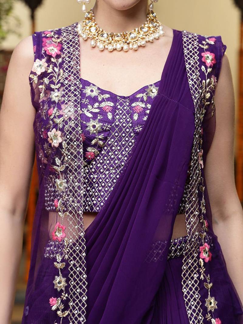 Purple printed embroidered georgette draped lehenga choli shrug free size upto 42