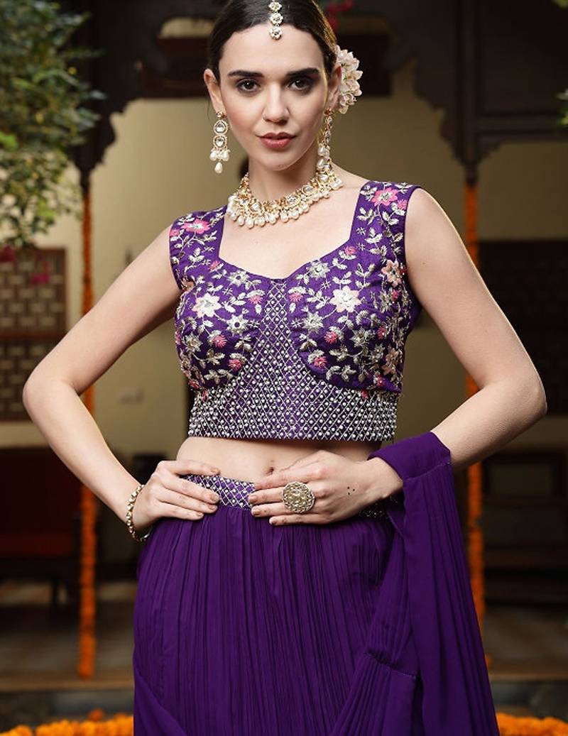| Product Name | Purple Printed Embroidered Georgette Draped Lehenga Choli Shrug Free Size Upto 42 | |