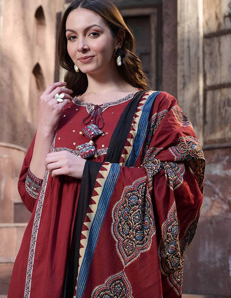 | Product Description | Maroon Solid Kurta With Trousers With Dupatta Kurta Design: |
