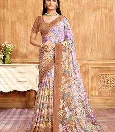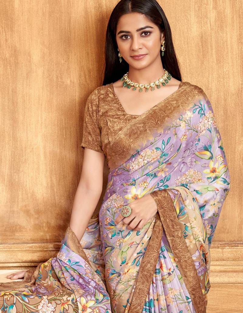 Brown purple floral printed crepe silk saree with unstitch blouse
