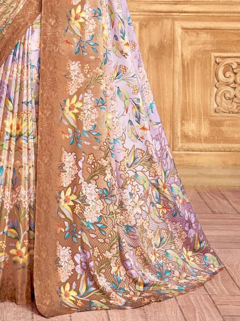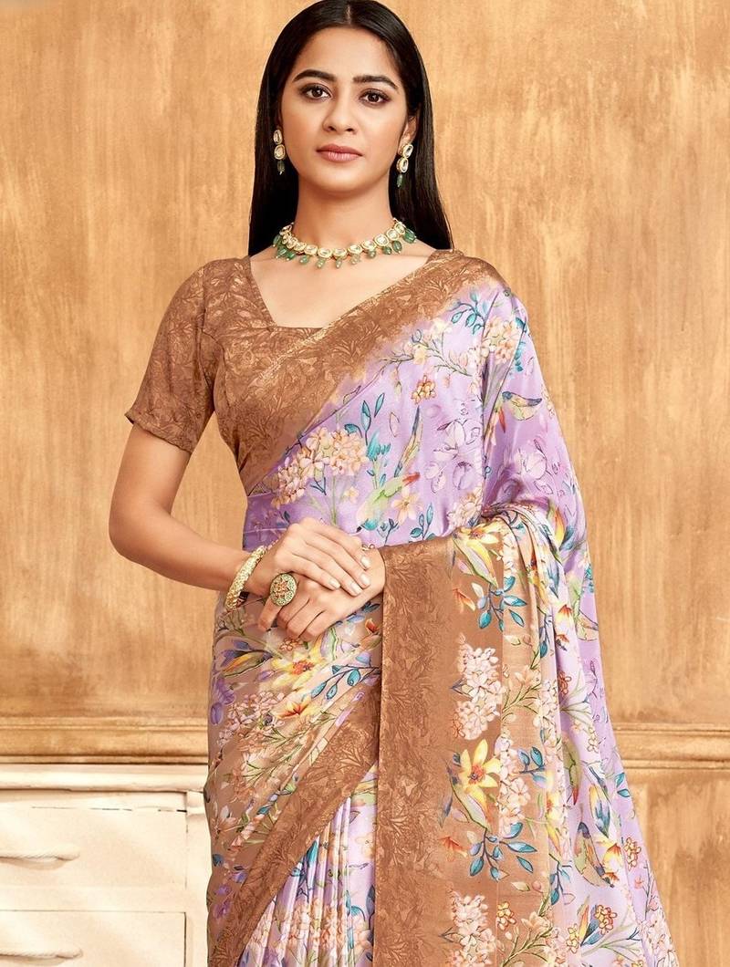 | Product Name | Brown Purple Floral Printed Crepe Silk Saree With Unstitch Blouse | |