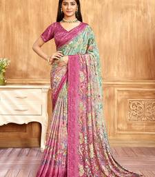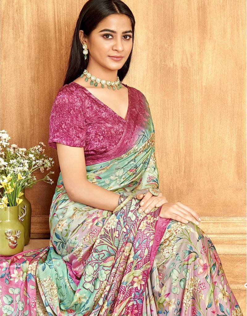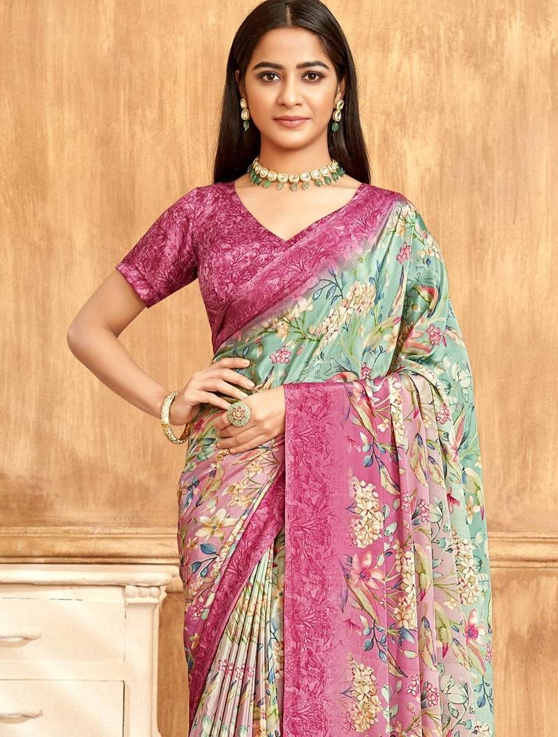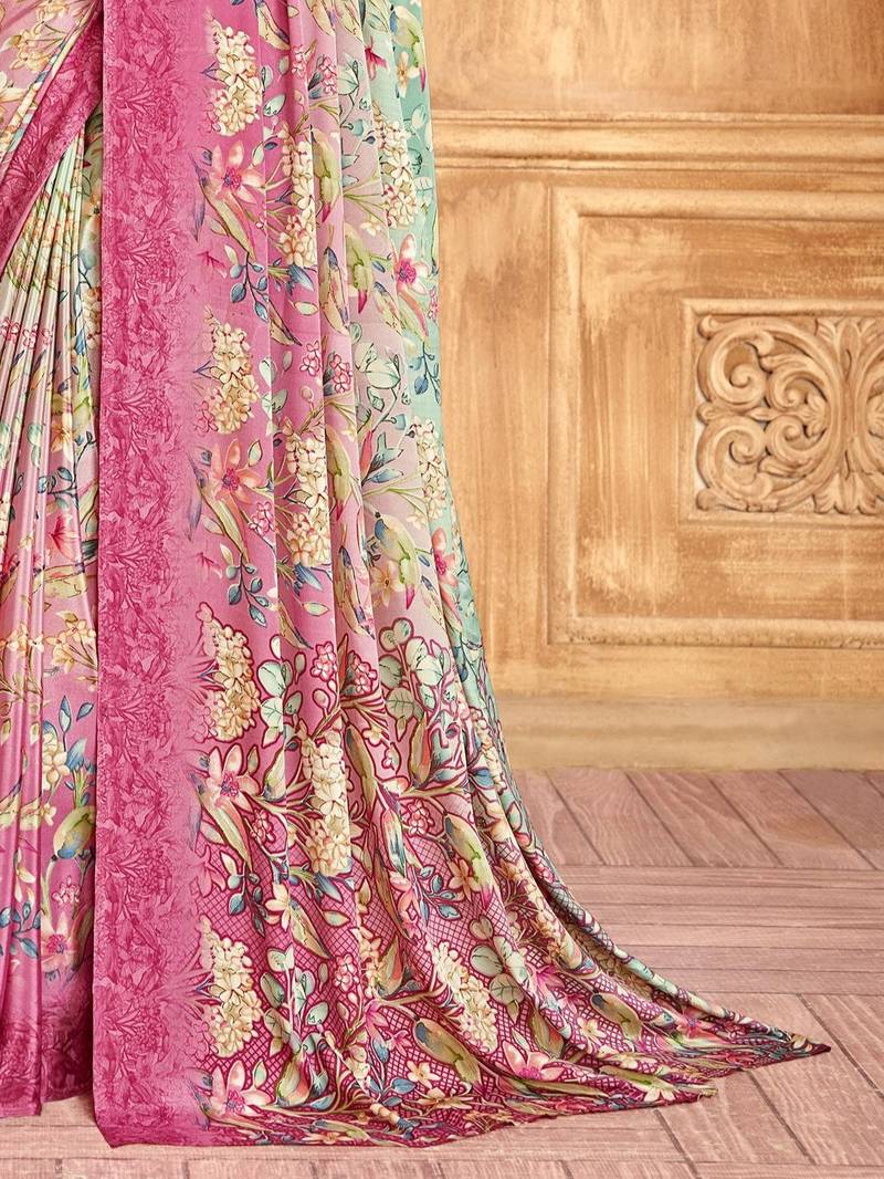 | Product Name | Pink Green Floral Printed Crepe Silk Saree With Unstitch Blouse | |