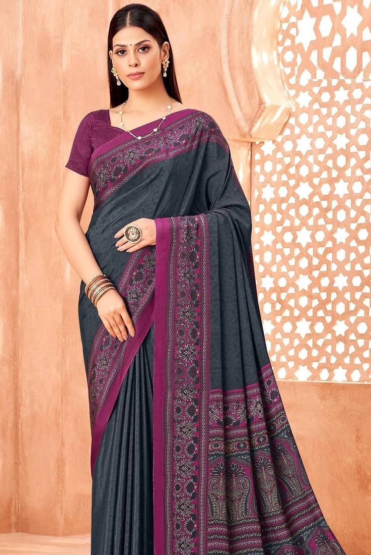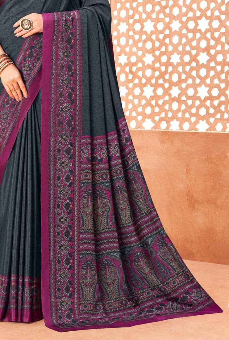 Slate grey traditional floral print silk crepe modern style saree with blouse