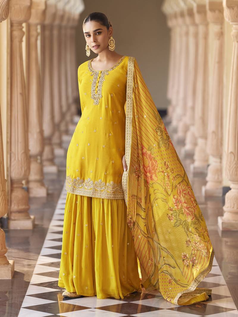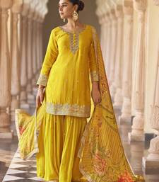 Yellow embroidered silk semi-stitch sharara suit with dupatta semi stitched