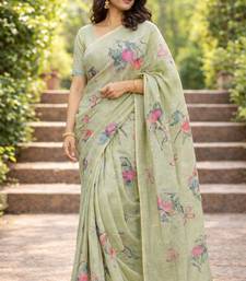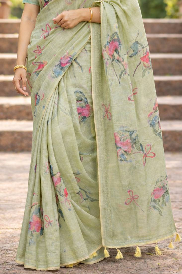 | Product Name | Sangam Prints Green Cotton Print With Aari Work Woven Work Traditional Saree | |