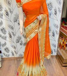 Chinon chiffon wedding wear saree in orange with embroidery work & crystal stone work