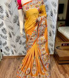 Fancy fabric party wear saree in mustard with embroidery work & crystal stone work