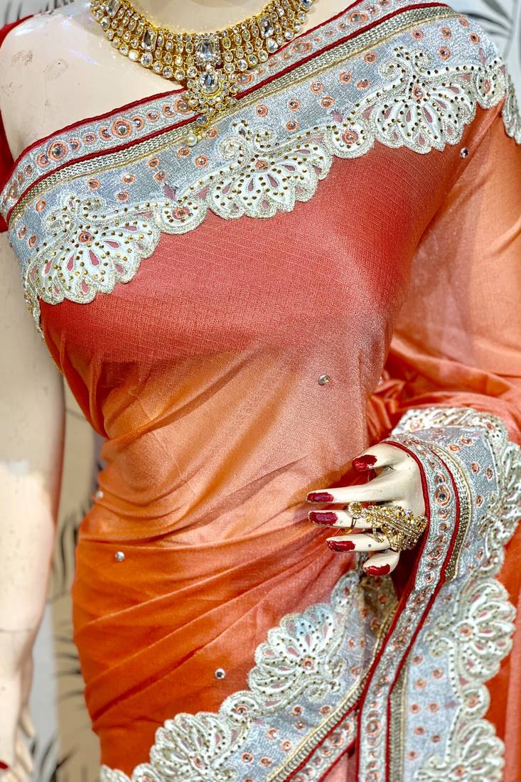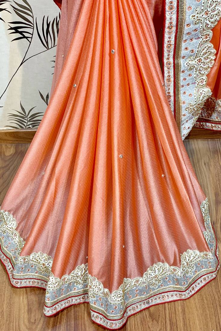 | Product Name | Fancy Fabric Silk Party Wear Saree In Peach With Embroidery Work & Crystal Stone Work | |