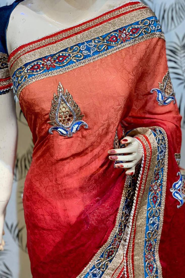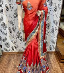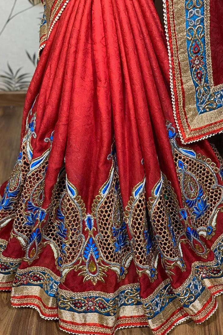 Fancy jacquard silk party wear saree in red with embroidery work & crystal stone work