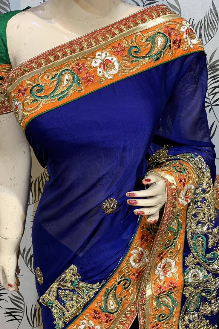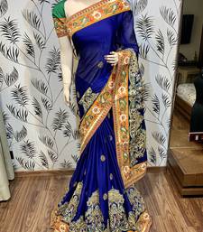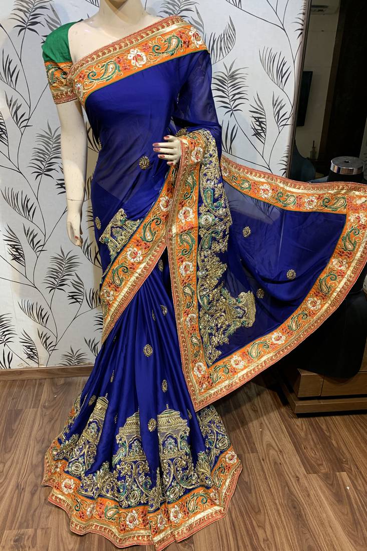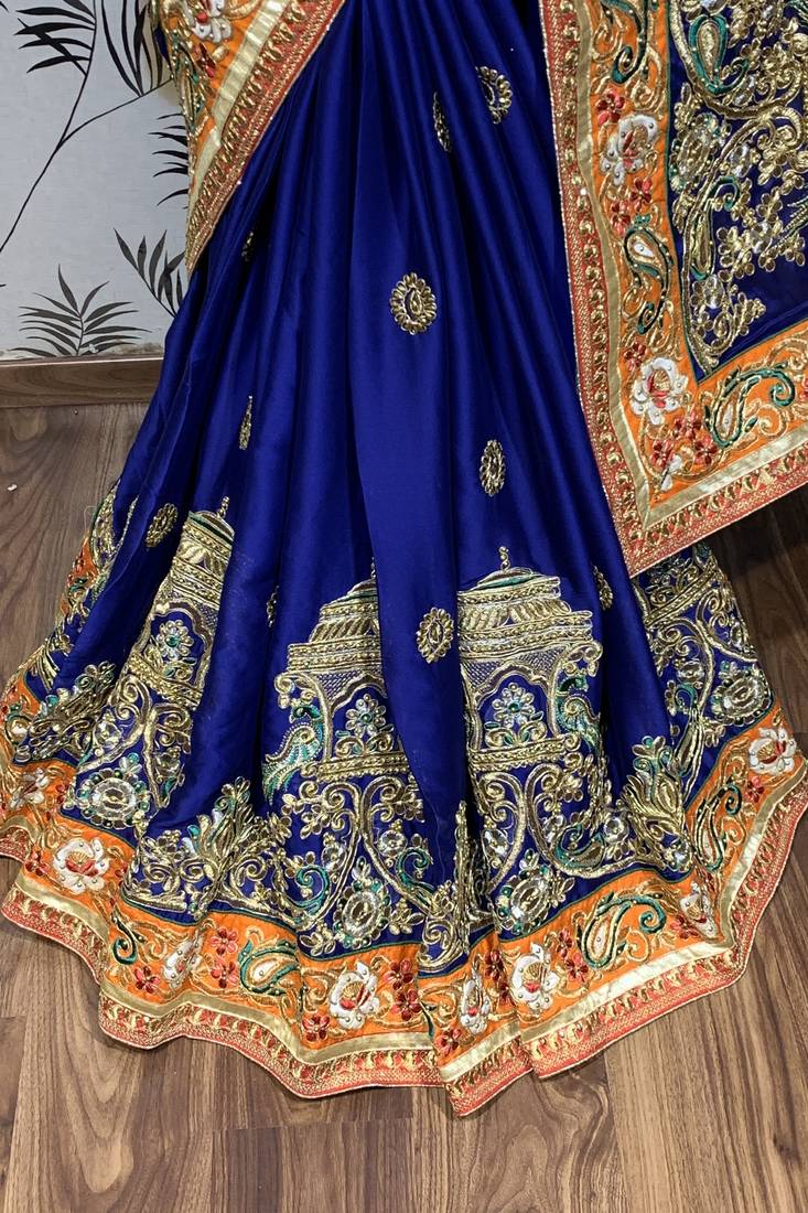 Mulberry silk wedding wear saree in blue with embroidery work & crystal stone work