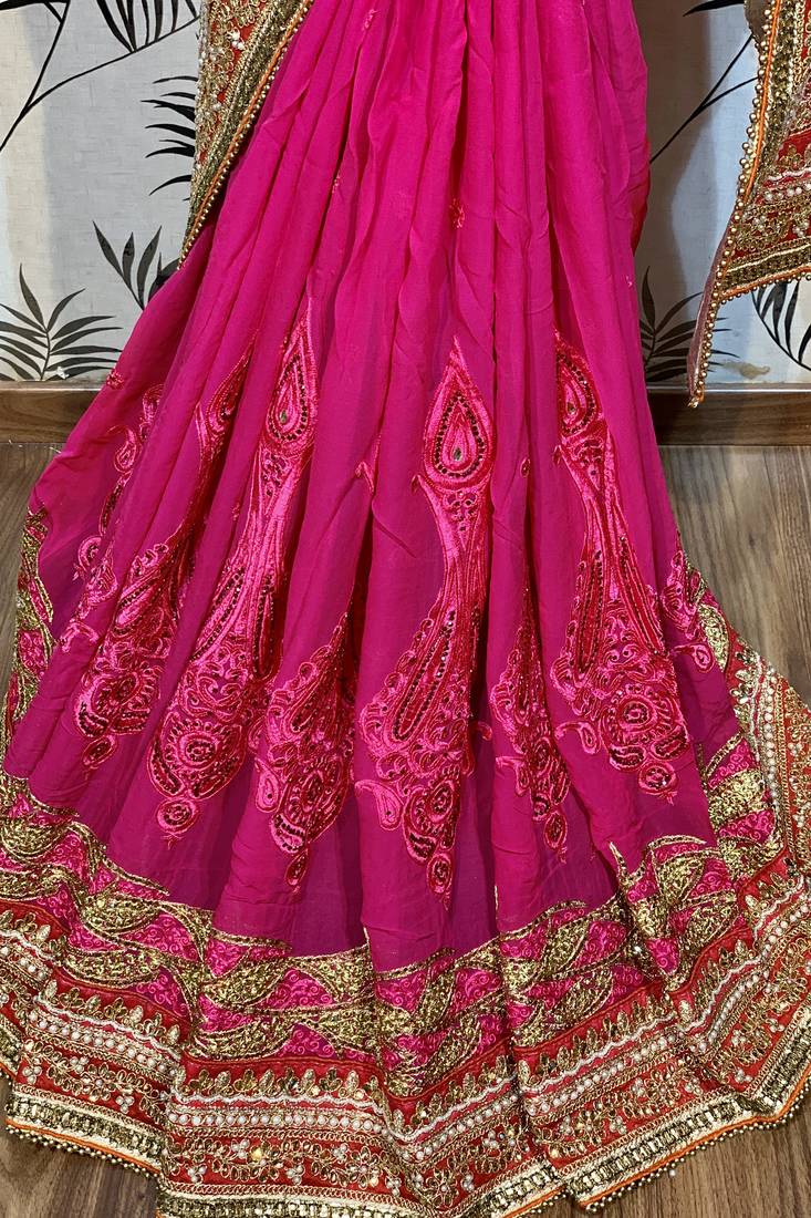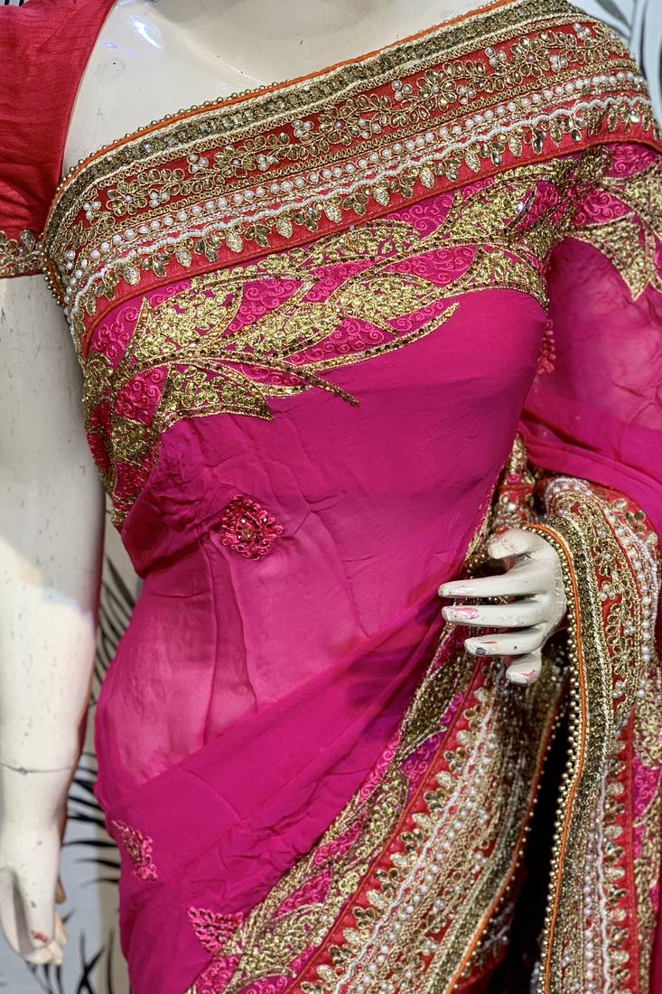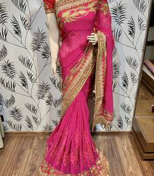 Pure georgette party wear saree in pink with embroidery work & crystal stone work