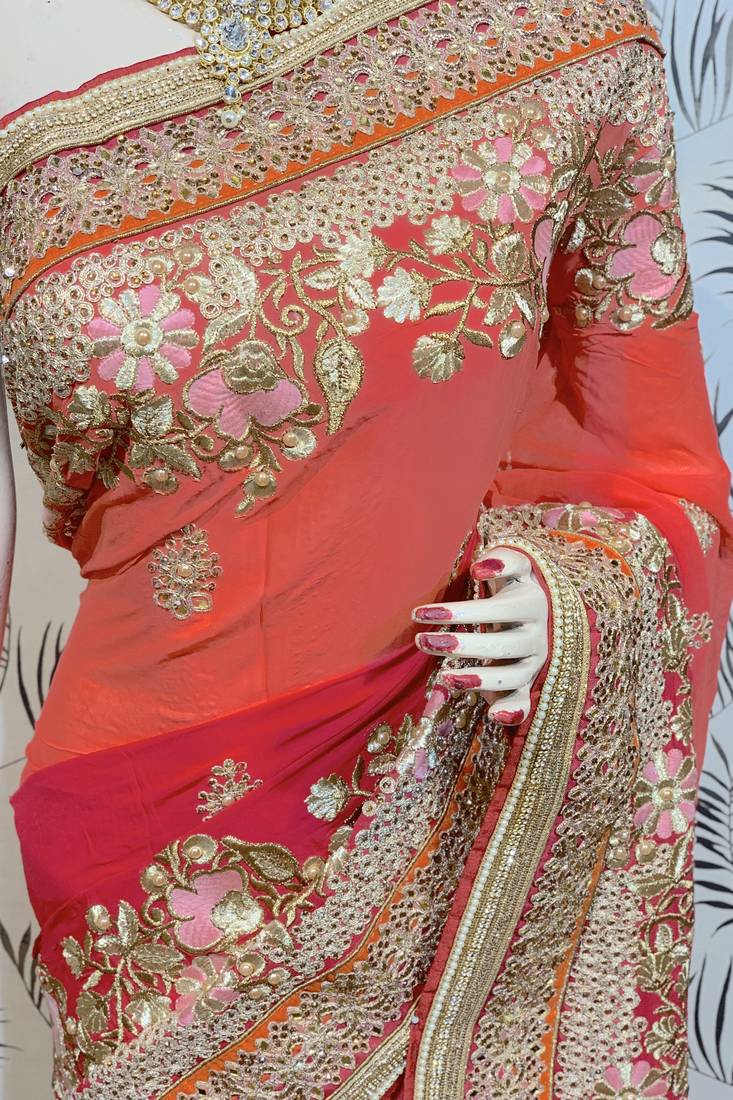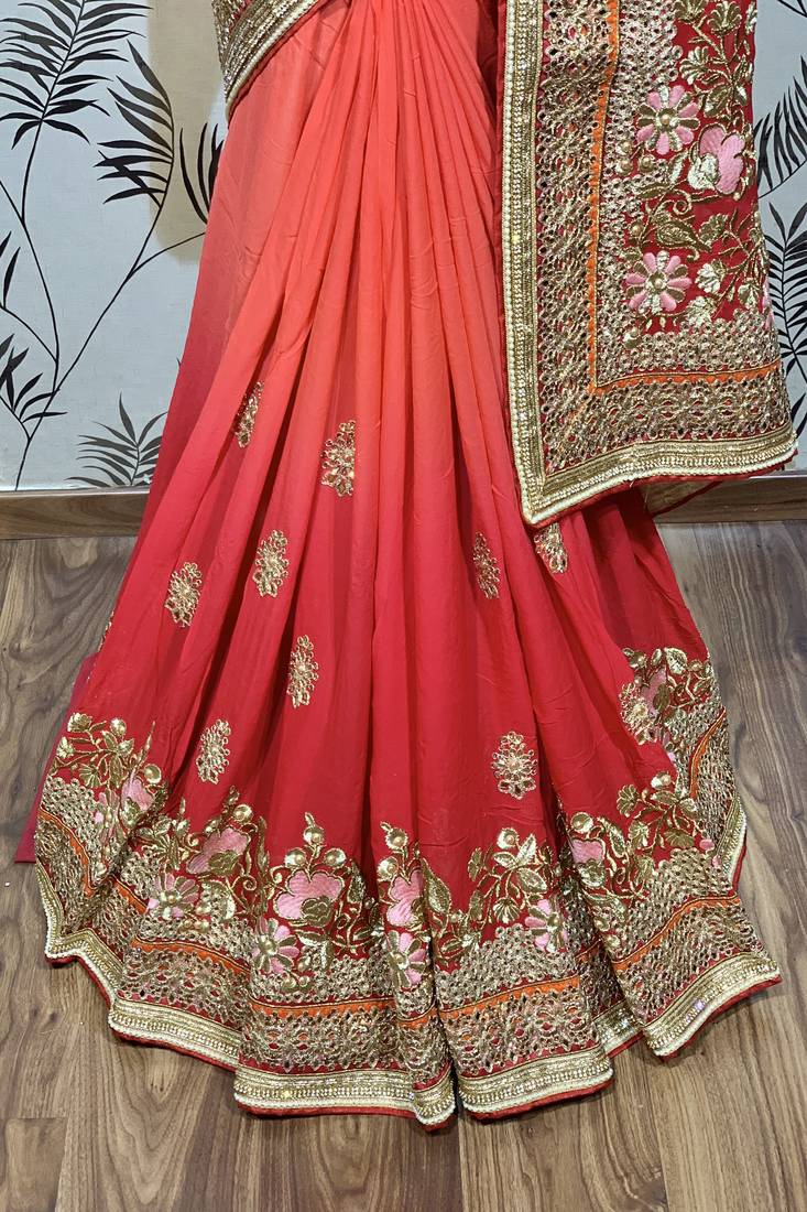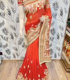 Pure georgette party wear saree in red with embroidery work & crystal stone work