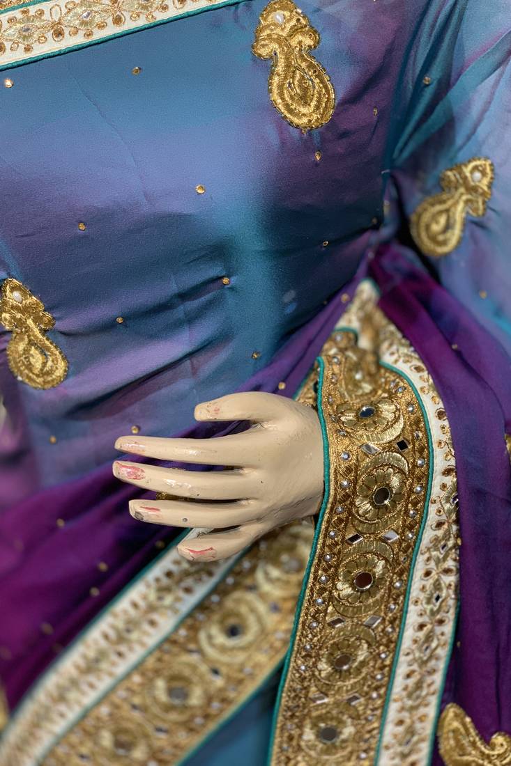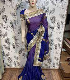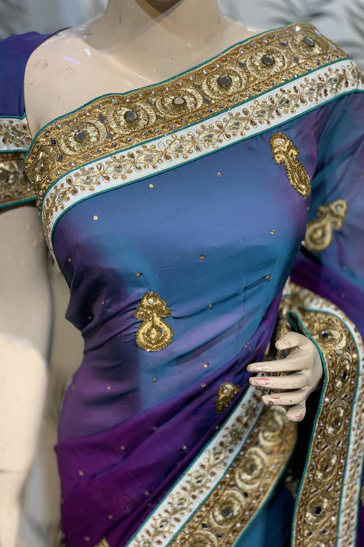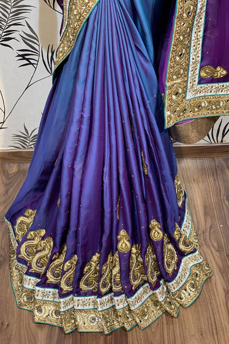 Pure shadow silk party wear saree in blue with embroidery work & crystal stone work