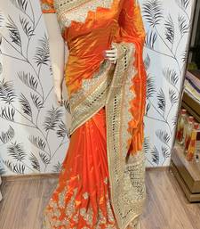 Pure silk party wear saree in orange with embroidery work & crystal stone work