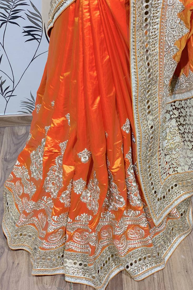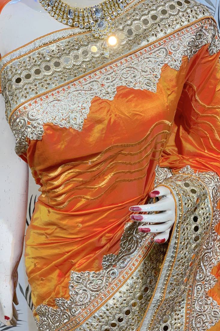 | Product Name | Pure Silk Party Wear Saree In Orange With Embroidery Work & Crystal Stone Work | |