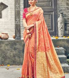 Pure silk party wear saree in peach color with embroidery work