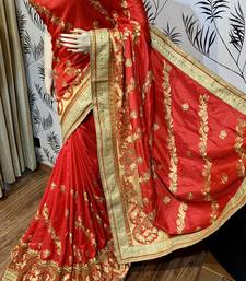Pure silk party wear saree in red with embroidery & crystal stone work