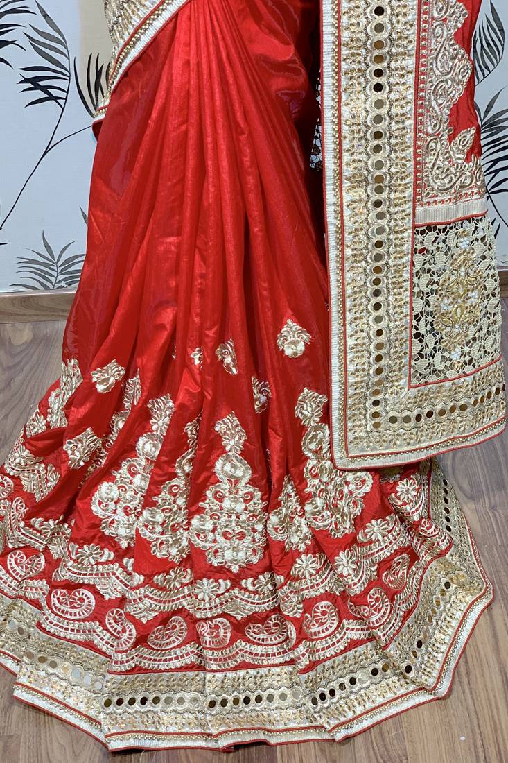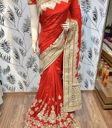 Pure silk party wear saree in red with embroidery work & crystal stone work