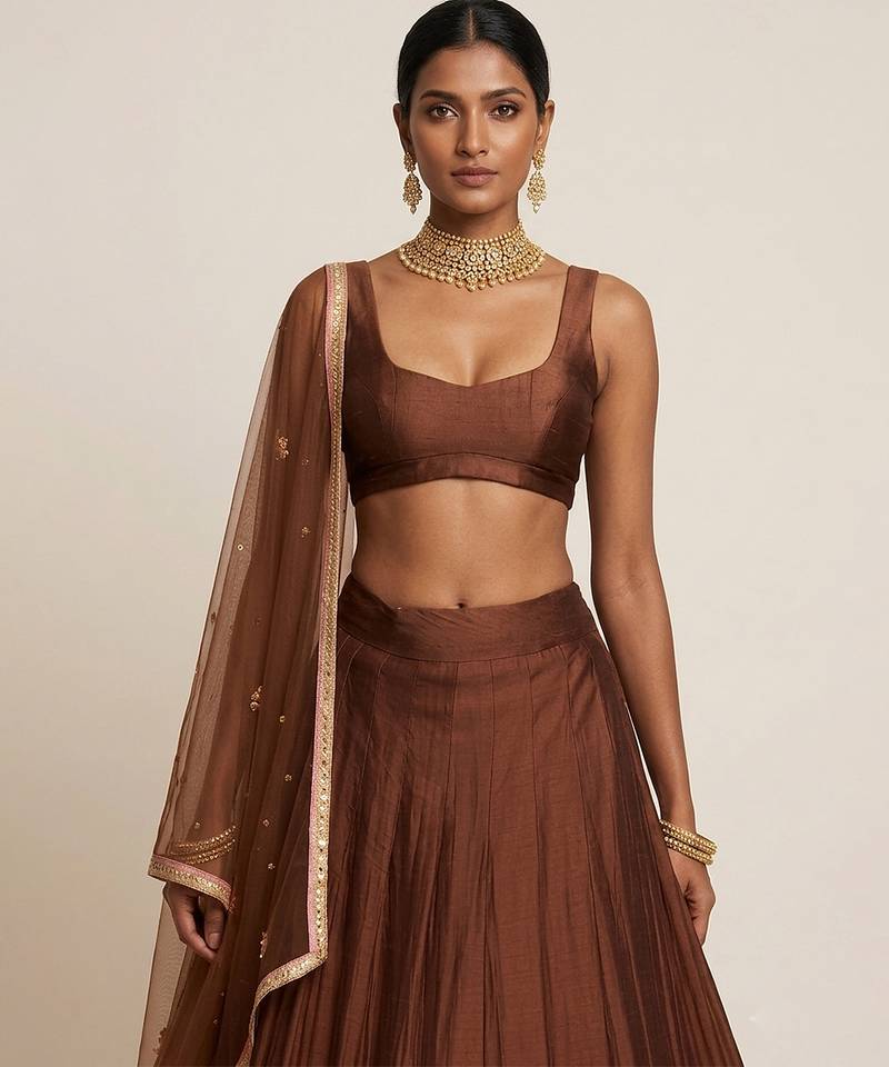 | Product Description | This Brown Silk Lehenga Set Features Intricate Embroidery That Adds Depth And Richness To Its Design. The Smooth Fabric Ensures Comfort And Elegance. Perfect For Festive Occasions, It Pairs Effortlessly With Minimal Or Bold Accessories For A Refined Appearance.