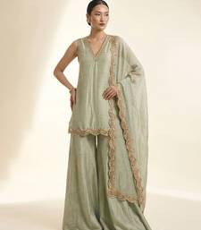 | Product Description | This Pastel Green Embroidered Silk Sharara Set Features A Soothing Tone With Intricate Detailing. The Flared Sharara Adds Movement And Grace, Making It Perfect For Festive Wear. A Stylish Ensemble That Reflects Elegance And Traditional Charm Effortlessly.