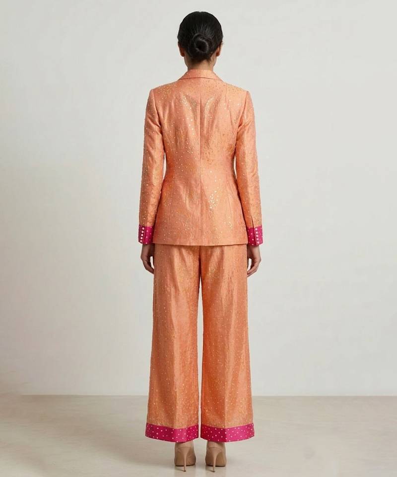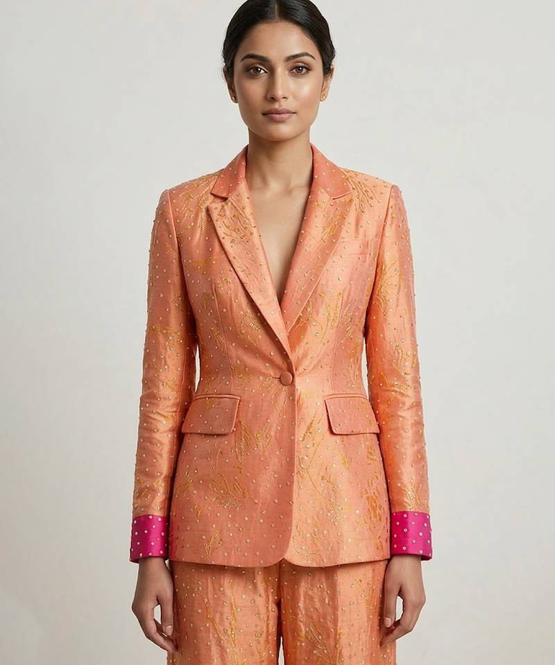 | Product Description | Crafted From Rich Woven Silk, This Peach Co Ord Set Radiates Subtle Sophistication And Grace. Its Soft Texture And Elegant Sheen Enhance The Overall Look, Making It Ideal For Festive Occasions Or Formal Gatherings. The Coordinated Design Ensures A Polished Appearance With Comfort And Timeless Charm.