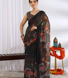 Mirchi fashion brown chiffon saree with floral print & unstitched blouse piece for women