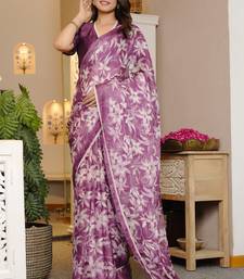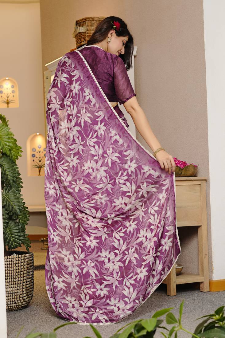 Mirchi fashion magenta chiffon saree with leaf block print & unstitched blouse piece for women