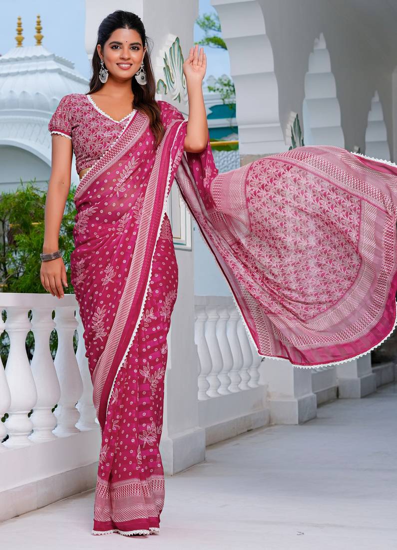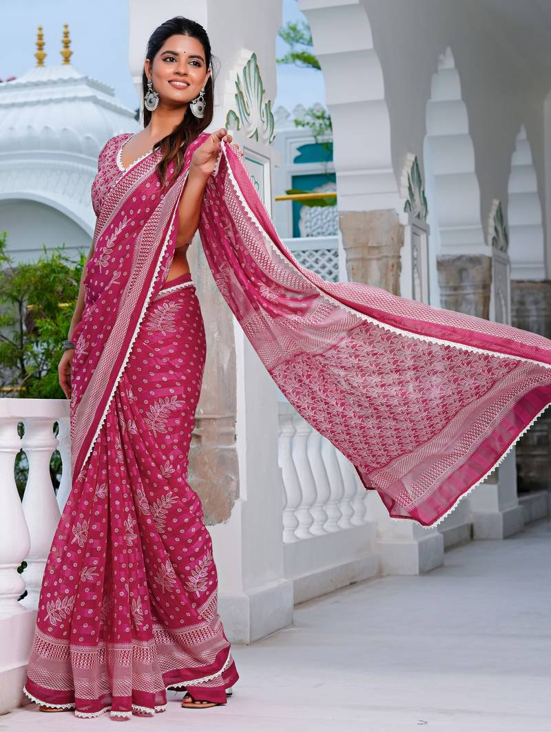 | Product Name | Mirchi Fashion Pink Chiffon Saree With Leaf Block Print & Unstitched Blouse Piece For Women | |