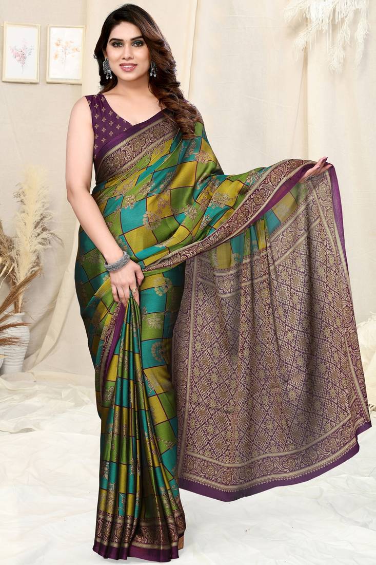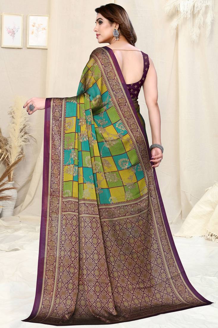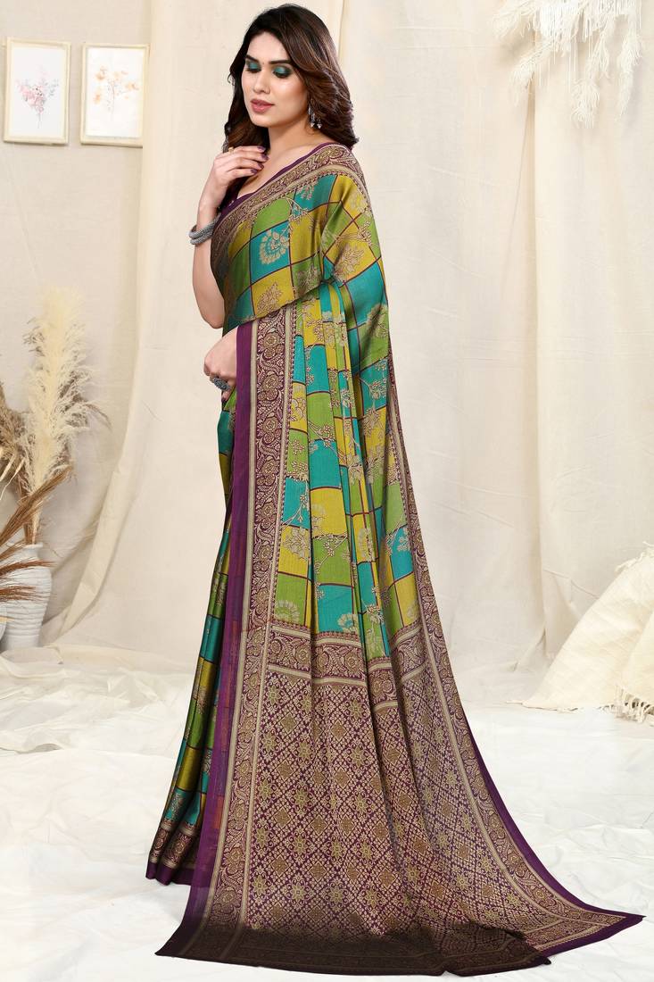 | Product Name | Teal/Green/Mustard Chiffon Colorblock/Checks/Floral Printed Saree With Unstitched Blouse Piece | |