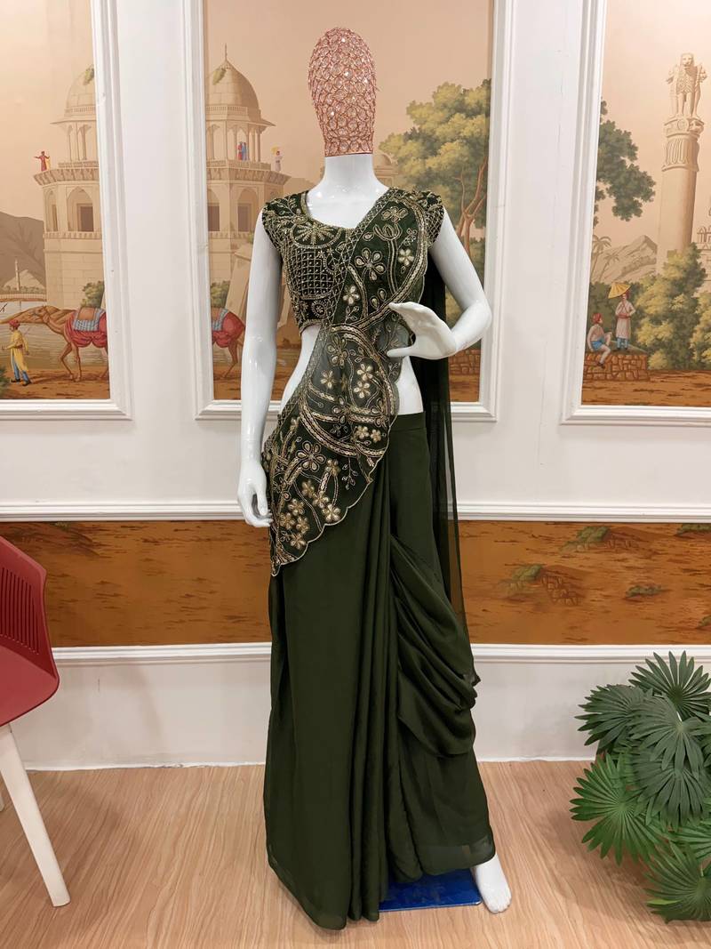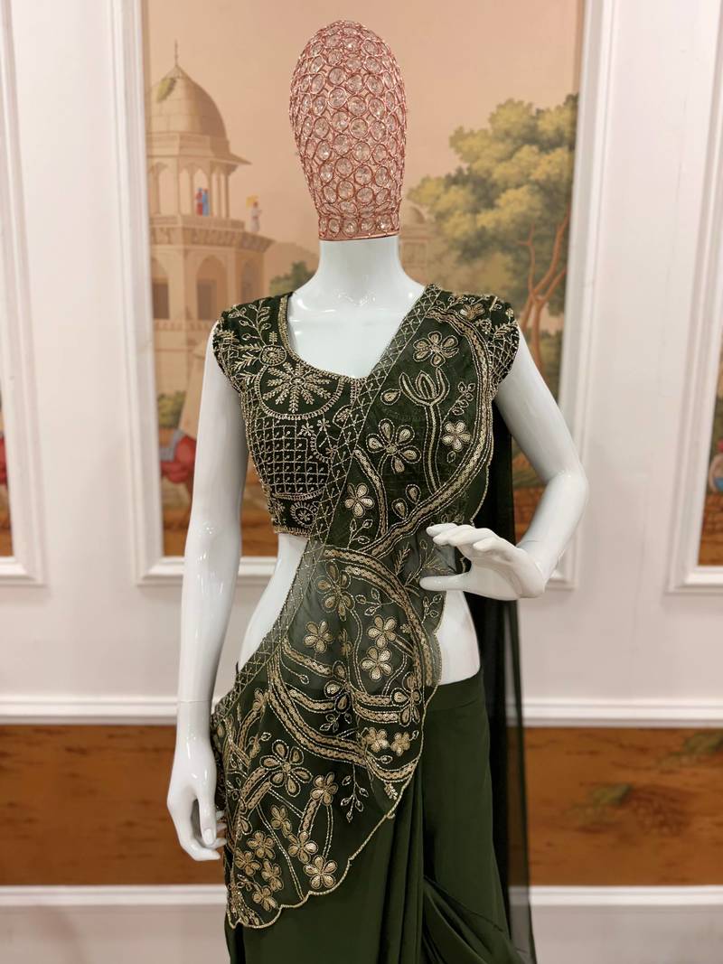 Mahendi color embroidery thread & semi beads work ready to wear silk saree