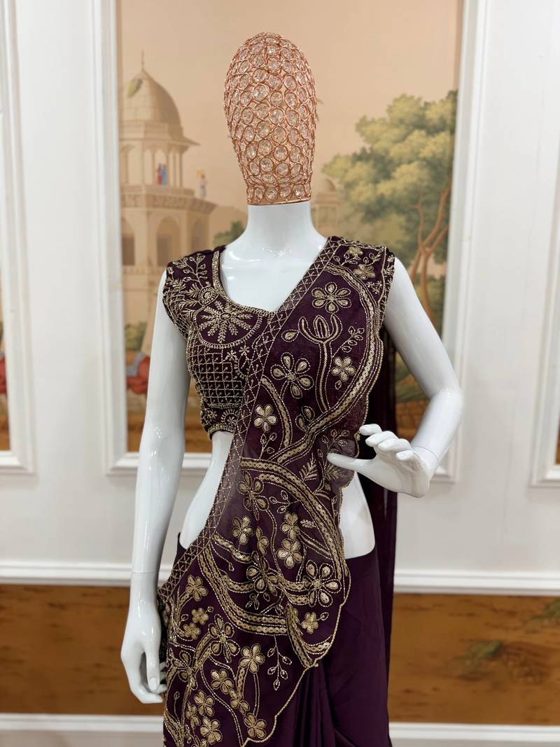 Wine color embroidery thread & semi beads work ready to wear silk saree