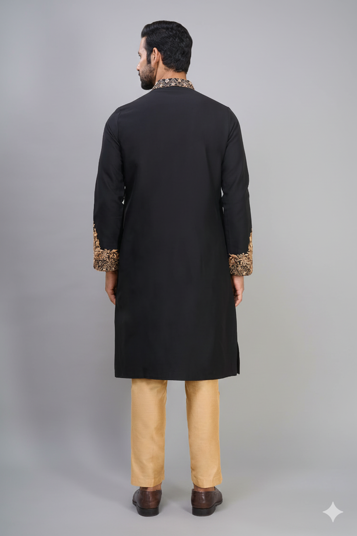 | Product Description | Add A Refined And Festive Touch To Your Ethnic Wardrobe With This Black Embroidered Kurta Pant Set For Men, Designed With A Clean And Rich Look. Crafted From Silk Fabric, The Kurta Offers A Smooth Feel With A Slight Shine, Giving A Polished Appearance. The Black Color Creates A Strong And Classic Base, While The Detailed Embroidery On The Neckline, Sleeves, And Hem Adds A Balanced And Elegant Finish. Paired With Antique Gold Pants, The Set Creates A Striking Contrast That Enhances The Overall Style. The Straight Fit Design Ensures Comfort And Ease Of Movement, Making It Suitable For Long Hours. This Kurta Pant Set Is A Great Choice For Festive Wear, Wedding Functions, And Traditional Occasions When Styled With Classic Footwear For A Complete Ethnic Look. |