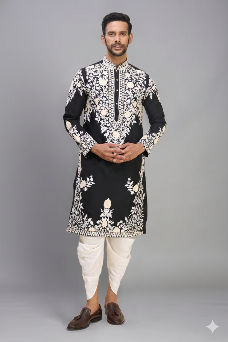 | Product Description | Make A Bold Festive Statement With This Black Embroidered Men’s Kurta Patiala Set, Designed With Detailed Craftsmanship And A Strong Traditional Look. Crafted From Silk Fabric, The Kurta Offers A Smooth Texture With A Subtle Sheen That Enhances The Overall Appearance. The Black Top Features Heavy Embroidery Across The Front, Sleeves, And Hem In A Contrasting Light Tone, Creating A Striking And Well Defined Design. The Off White Patiala Bottom, Made From Silk, Provides A Comfortable And Relaxed Fit With Its Pleated Style. The Contrast Between The Deep Black Kurta And Light Bottom Creates A Sharp And Well Balanced Outfit. Ideal For Weddings, Festive Occasions, And Cultural Celebrations, This Kurta Patiala Set Pairs Well With Traditional Footwear For A Complete And Confident Ethnic Look. |