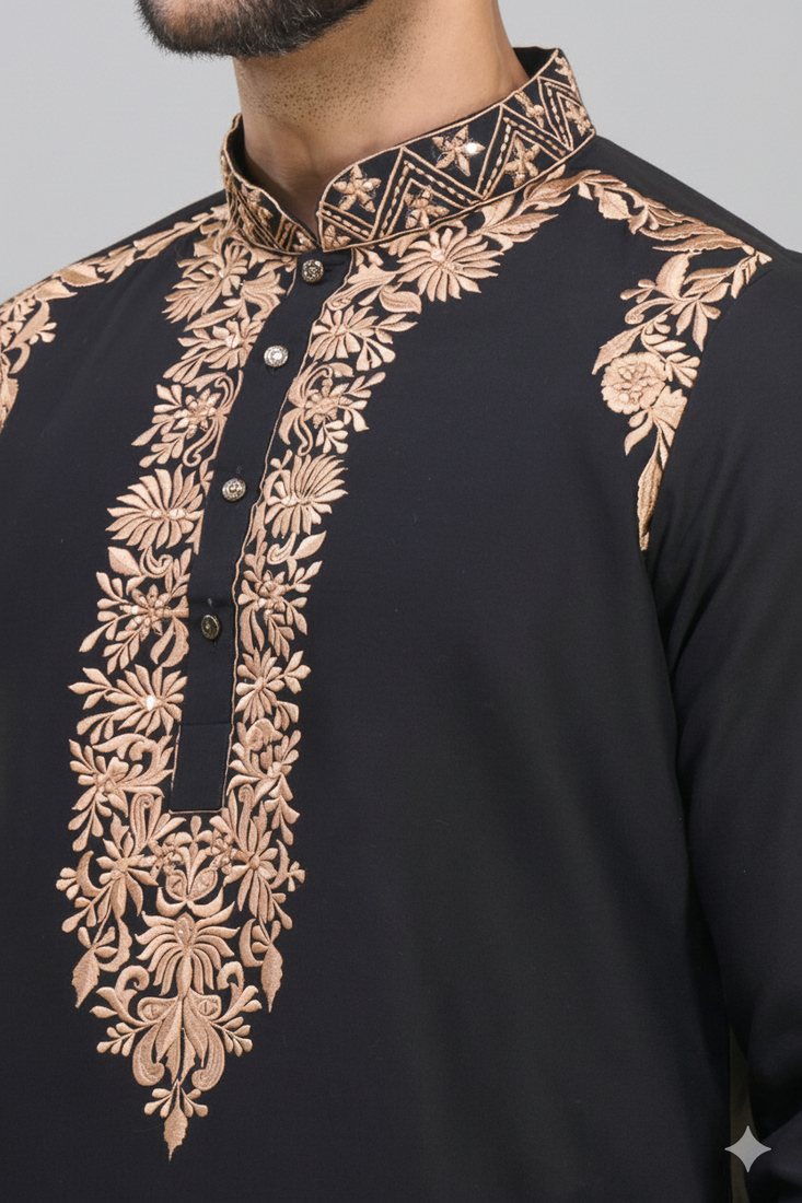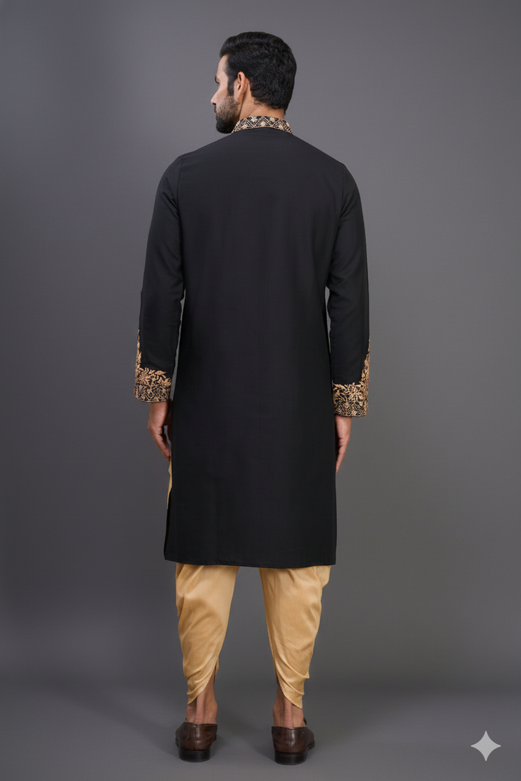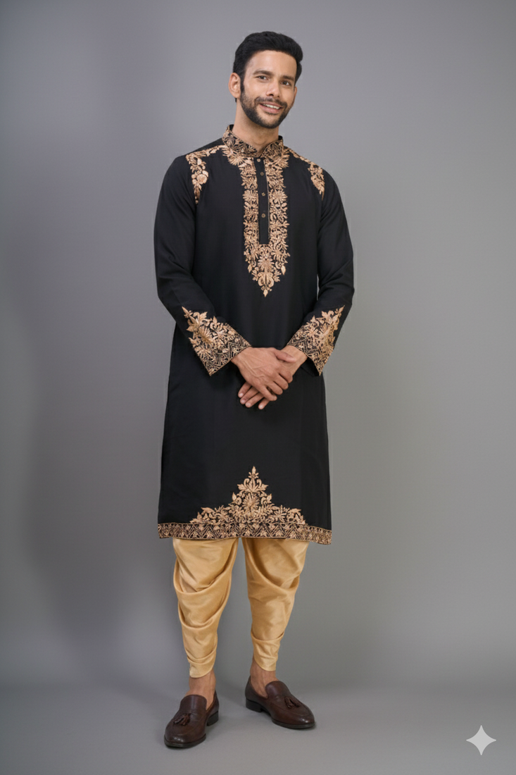 Black embroidery work silk men’s kurta patiala set