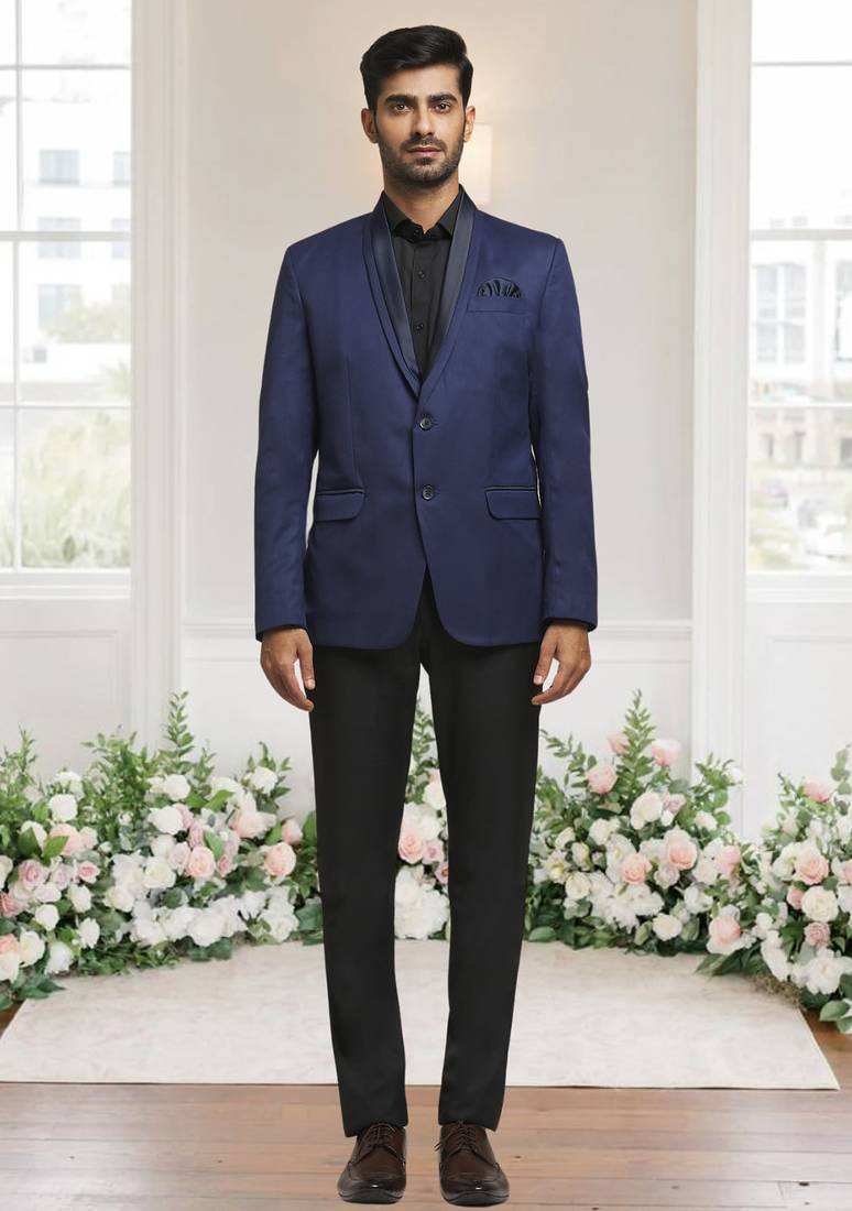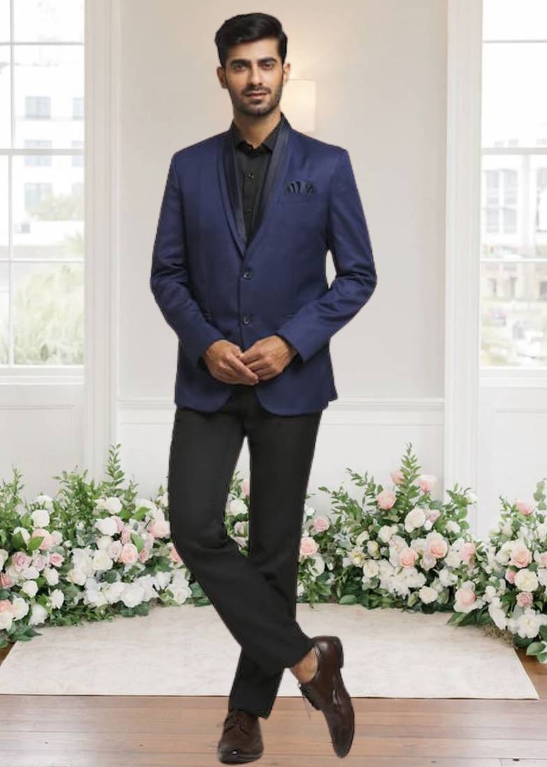| Product Description | The Ensemble Features A Sophisticated Blue Blazer With A Sleek Black Satin Shawl Lapel And Matching Black Pocket Detailing, Offering A Sharp Contrast Against The Rich Tone. It Is Paired With Classic Black Formal Trousers, Creating A Refined, Modern Look Perfect For Formal Events Or Evening Occasions. |