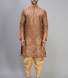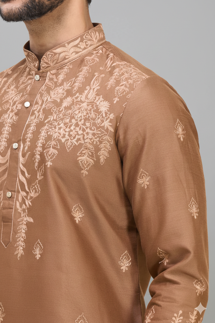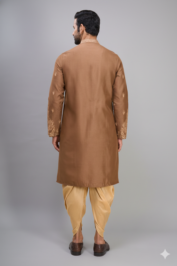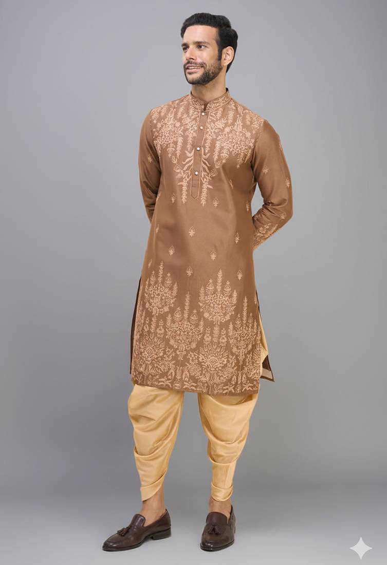 | Product Description | Step Into Refined Ethnic Style With This Chiku Kurta Patiala Set, Designed To Offer A Perfect Balance Of Tradition And Sophistication. Crafted In A Smooth Cotton Silk Blend, The Kurta Features Intricate Tonal Embroidery Across The Front, Sleeves, And Hem, Creating A Rich Yet Elegant Visual Appeal. The Mandarin Collar And Buttoned Placket Add A Structured Finish, While The Straight Cut Silhouette Ensures A Flattering And Comfortable Fit. Paired With A Contrasting Patiala Bottom In A Soft Golden Beige Tone, This Ensemble Brings Out A Regal And Festive Charm. Ideal For Weddings, Festive Celebrations, And Special Occasions, This Kurta Set Makes A Strong Style Statement Without Being Overpowering. Pair It With Classic Mojaris Or Loafers To Complete The Look. A Perfect Choice For Men Who Appreciate Detailed Craftsmanship With A Modern, Polished Touch. |