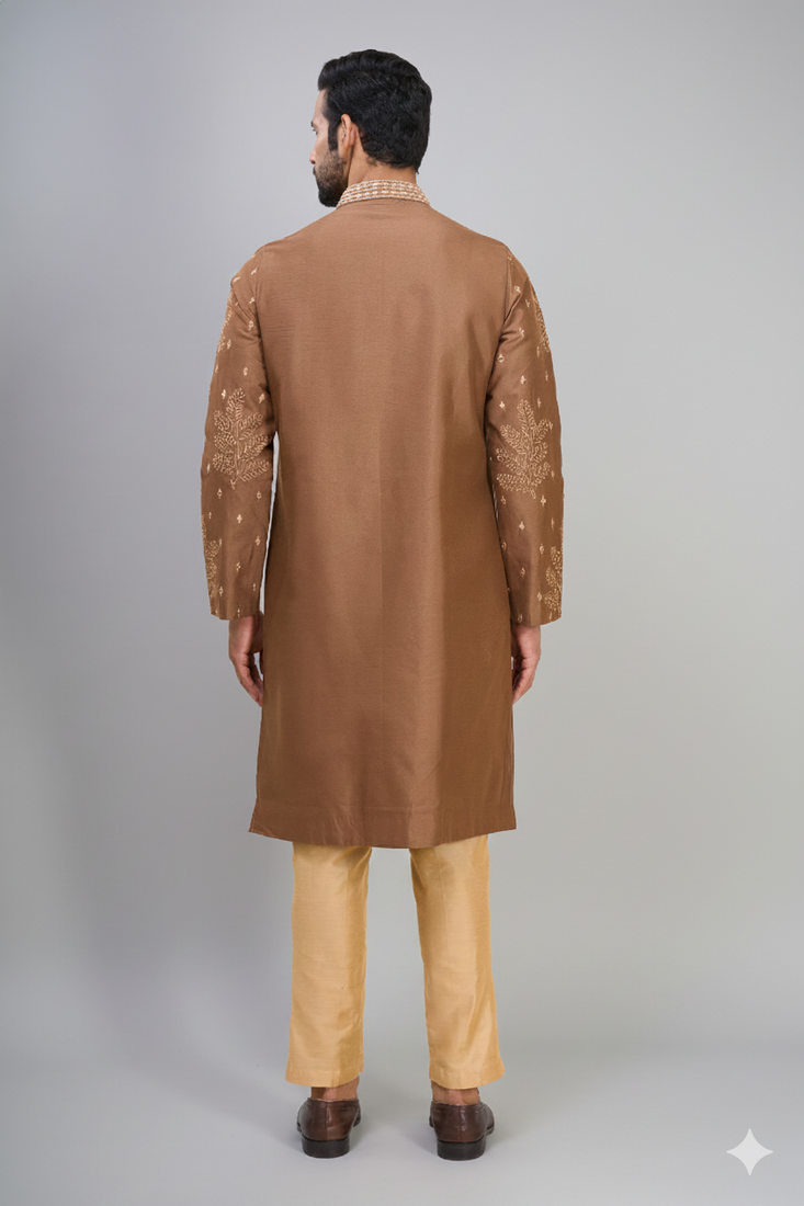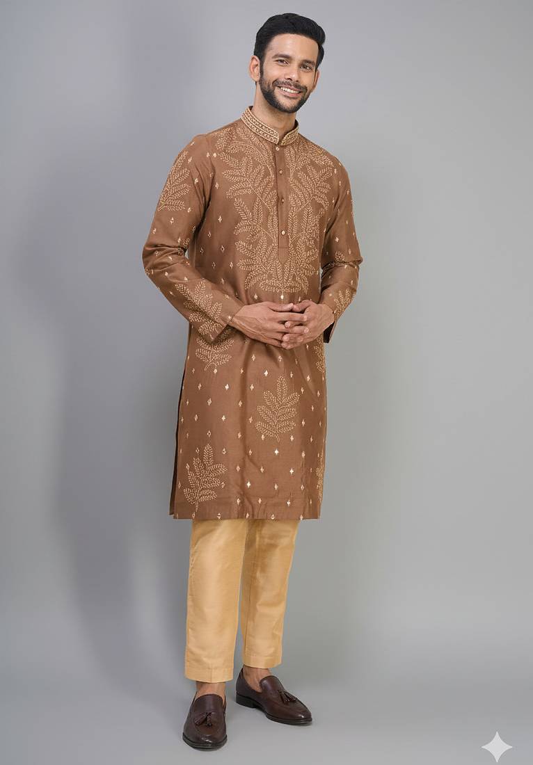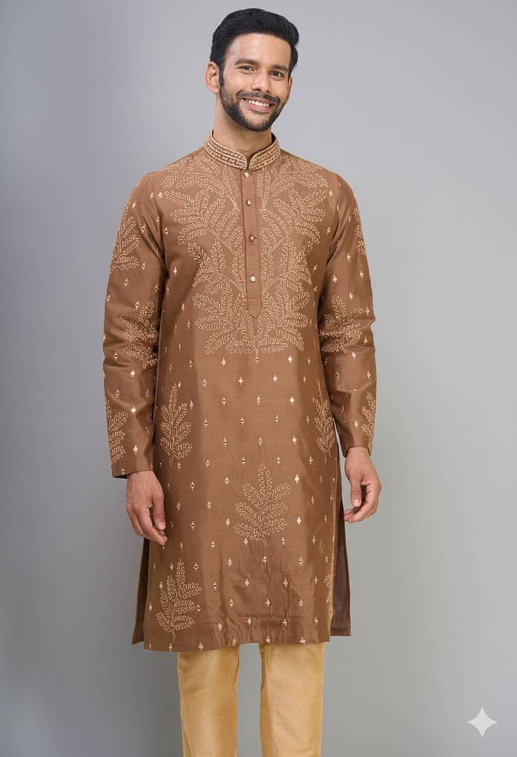 | Product Description | This Kurta Pant Set Is Made Using Silk Fabric. The Kurta Features A Coffee Colored Base With Brown Tone Detailing And Embroidered Work Across The Fabric. It Is Designed With A Chinese Collar Neckline And Full Sleeves. The Stitched Kurta Is Paired With A Silk Trouser In Antique Gold Color. The Trouser Follows A Straight Fit Style. Both Pieces Are Made From Silk Fabric For Uniform Material Structure. The Outfit Follows Traditional Indian Wear Style Used For Wedding Occasions. The Embroidery Is Placed On The Kurta Surface For Visible Design Pattern. The Set Includes Coordinated Kurta And Pant In Matching Tones. |
