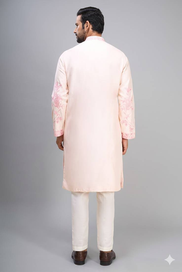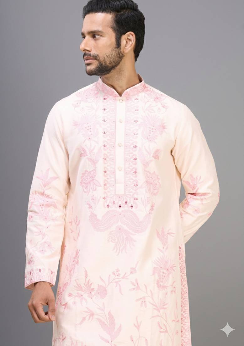 | Product Name | Men’s Cream Silk Kurta Set With Pink Floral Embroidery | |