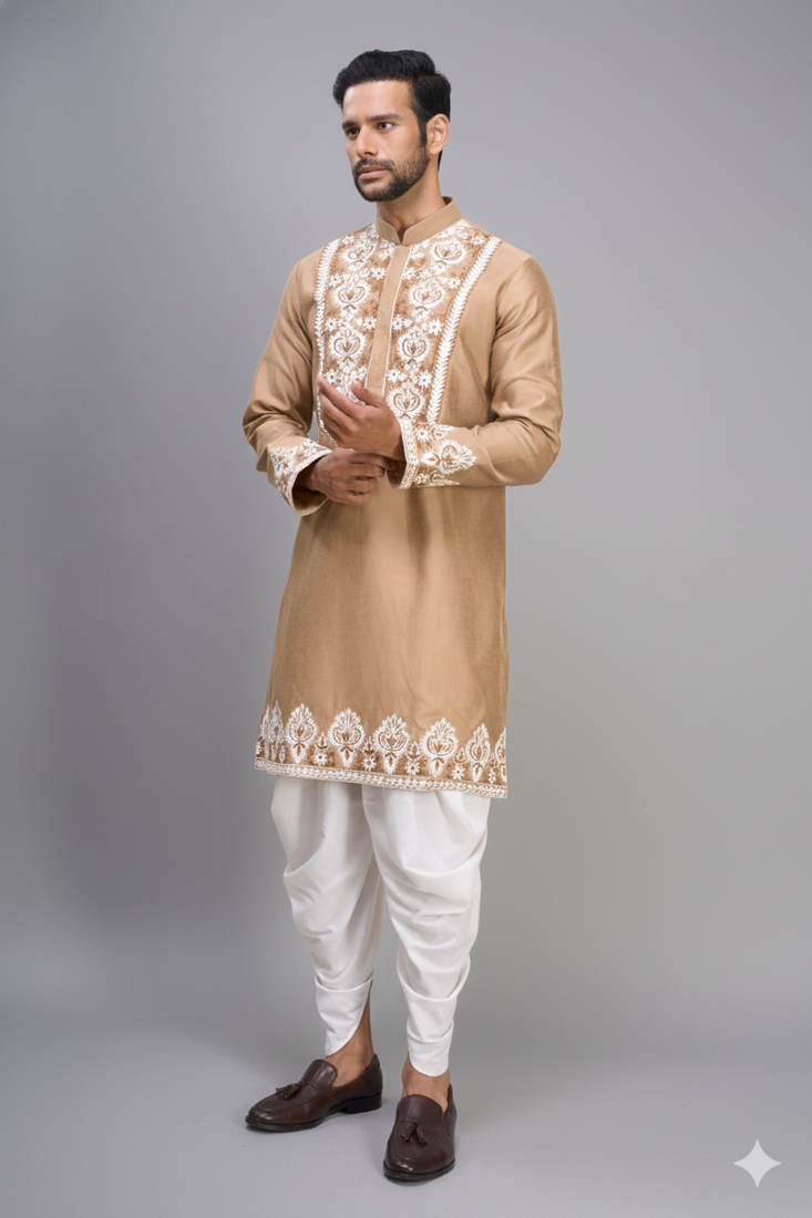 Beige embroidered silk men’s kurta patiala set