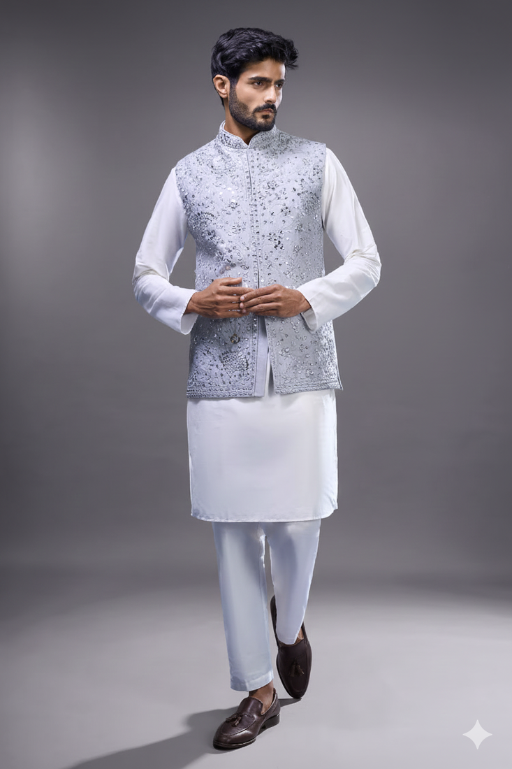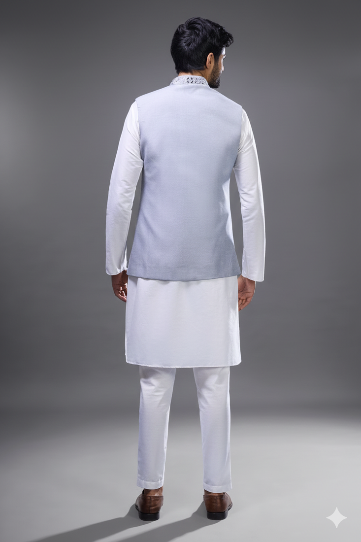 | Product Description | Upgrade Your Festive Look With This Grey Embroidered Mirror Work Kurta Set, Paired With A Stylish Nehru Jacket For A Smart And Refined Ethnic Appearance. Made From Quality Fabric, The White Kurta Offers A Clean And Smooth Base That Keeps The Overall Look Simple And Balanced. The Highlight Is The Grey Nehru Jacket, Designed With Detailed Embroidery And Mirror Work That Adds Shine And Texture Without Looking Heavy. The Structured Fit Of The Jacket Enhances The Outfit, Giving It A Sharp And Well Finished Look. Paired With Matching White Pants, This Set Is Comfortable To Wear And Easy To Carry For Long Hours. Perfect For Wedding Functions, Festive Gatherings, And Special Occasions, This Kurta Jacket Set Pairs Well With Mojaris Or Loafers For A Complete Traditional Style. |