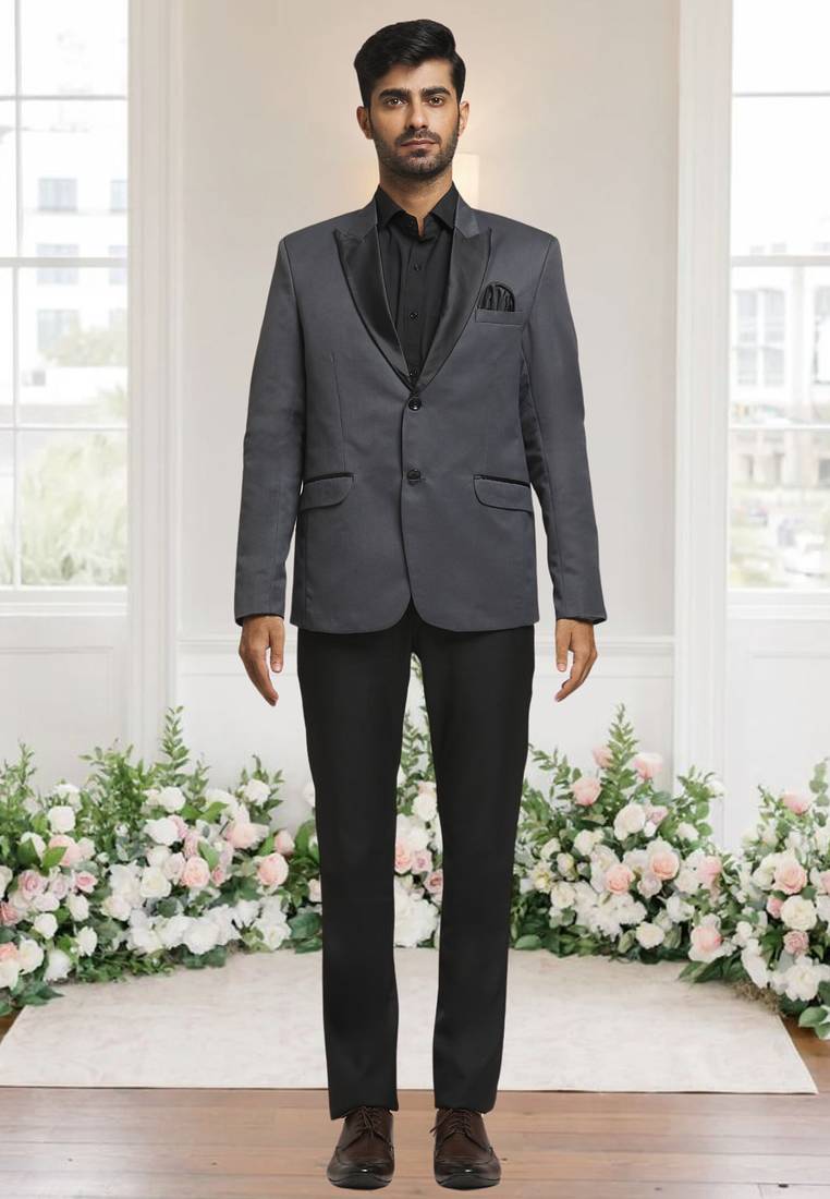 | Product Description | The Ensemble Features A Sophisticated Grey Blazer With A Sleek Black Satin Shawl Lapel And Matching Black Pocket Detailing, Offering A Sharp Contrast Against The Rich Tone. It Is Paired With Classic Black Formal Trousers, Creating A Refined, Modern Look Perfect For Formal Events Or Evening Occasions. |