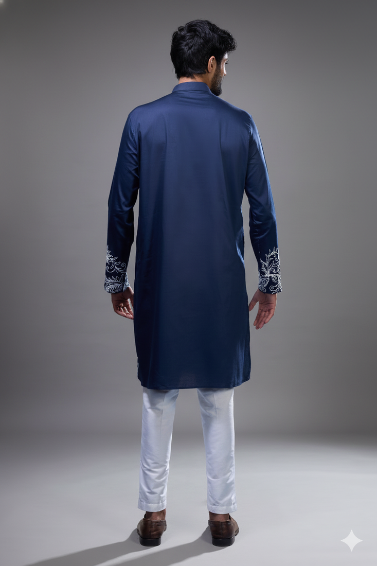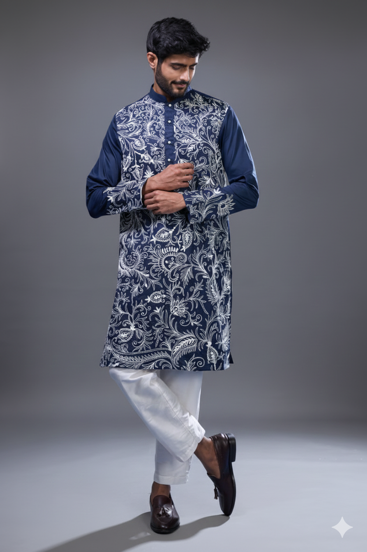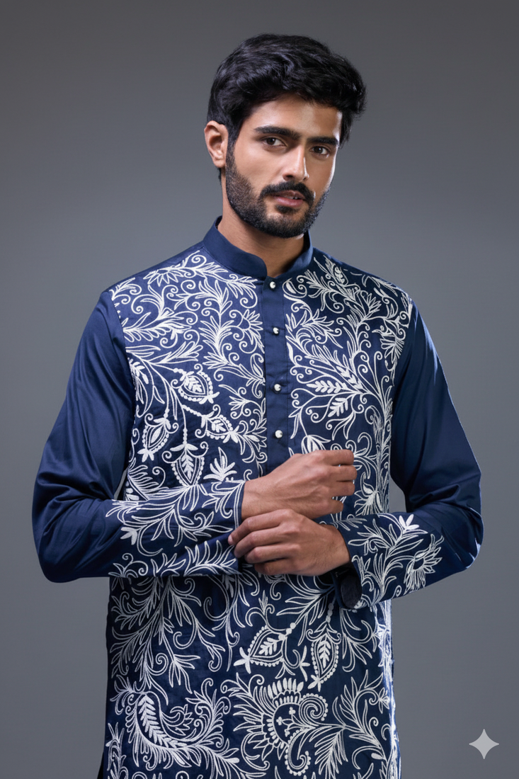 | Product Description | Make A Bold Ethnic Statement With This Navy Blue Kurta Pant Set For Men, Designed With Rich Allover Floral Embroidery. The Kurta Features Intricate Threadwork Spread Across The Front, Complemented By Detailed Cuffs And A Clean Mandarin Collar For A Refined Finish. Paired With A Classic Straight Fit Pant, It Offers A Balanced Blend Of Traditional Elegance And Modern Tailoring. Crafted From Premium Silk Fabric, The Outfit Delivers A Subtle Sheen With A Smooth And Comfortable Feel. The Deep Navy Tone Enhances The Striking Embroidery, Making It Ideal For Weddings, Evening Functions, And Festive Occasions. With Its Standout Design And Luxurious Appeal, This Ensemble Is Perfect For Men Who Want A Distinctive And Stylish Ethnic Look. |