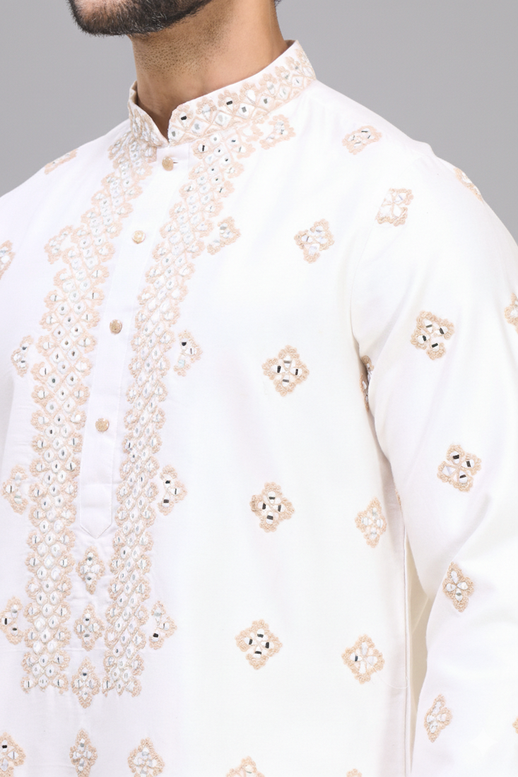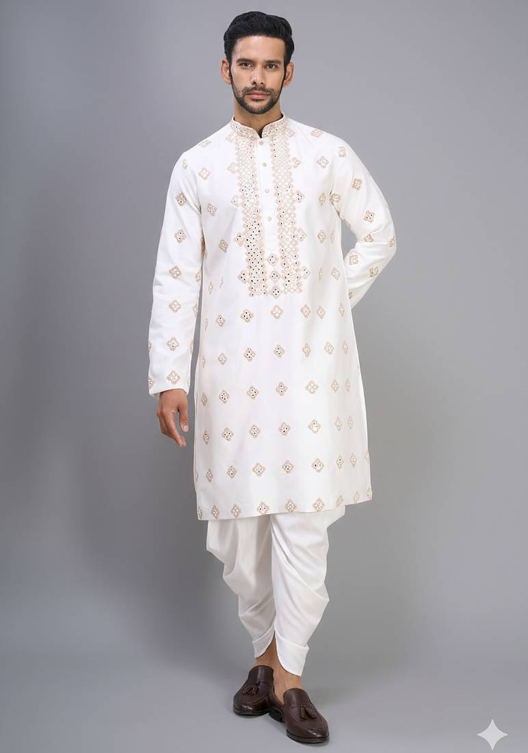 | Product Description | Create A Clean And Refined Festive Look With This Off White Embroidered Men’s Kurta Patiala Set, Designed With Subtle Detailing And A Balanced Traditional Style. Crafted From Silk Fabric, The Kurta Offers A Smooth Texture With A Soft Sheen That Enhances The Overall Appearance. The Off White Top Features Detailed Embroidery Across The Front And Small Motifs Throughout, Adding Depth While Keeping The Design Light And Elegant. The Matching Patiala Bottom In Silk Provides A Comfortable And Relaxed Fit With Its Pleated Structure. The Coordinated Off White Tone Creates A Neat And Well Finished Outfit That Looks Polished Without Being Heavy. Ideal For Weddings, Festive Occasions, And Traditional Gatherings, This Kurta Patiala Set Pairs Well With Classic Footwear For A Complete And Confident Ethnic Look. |