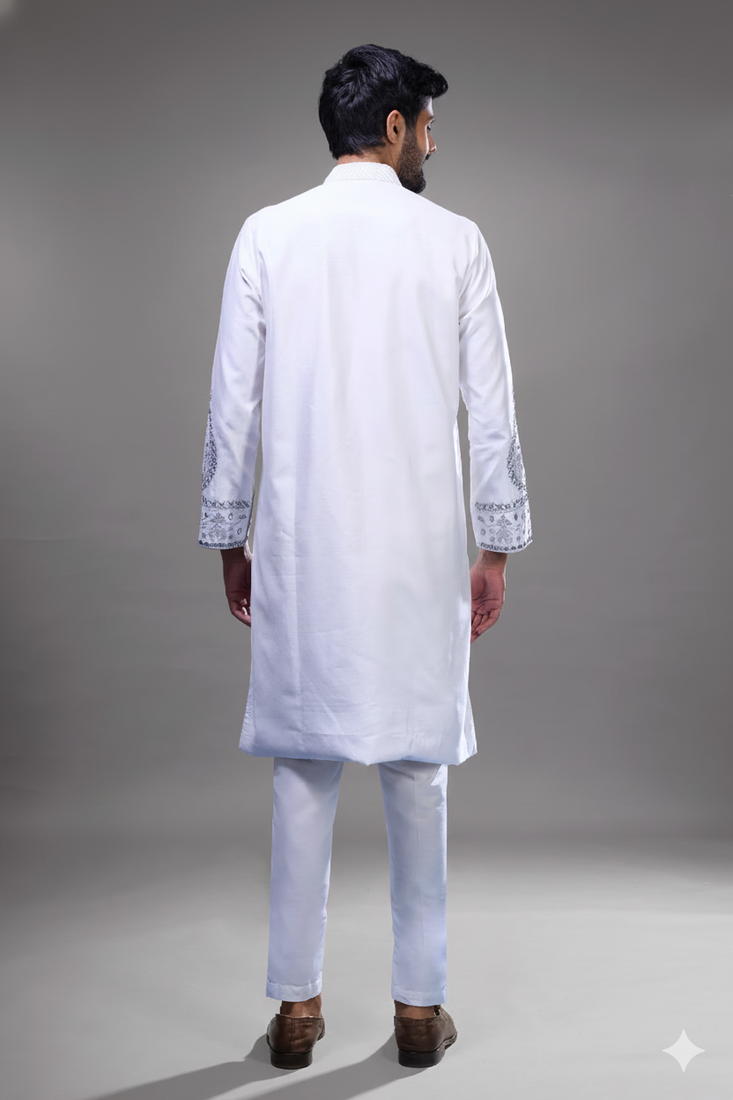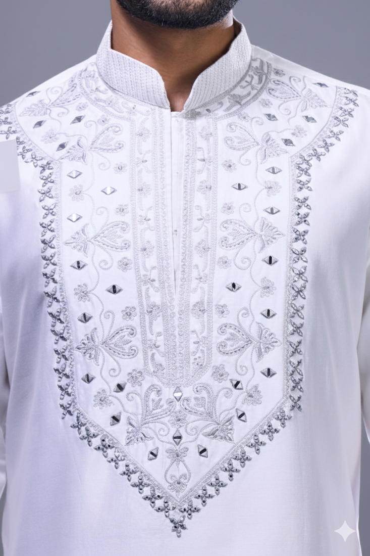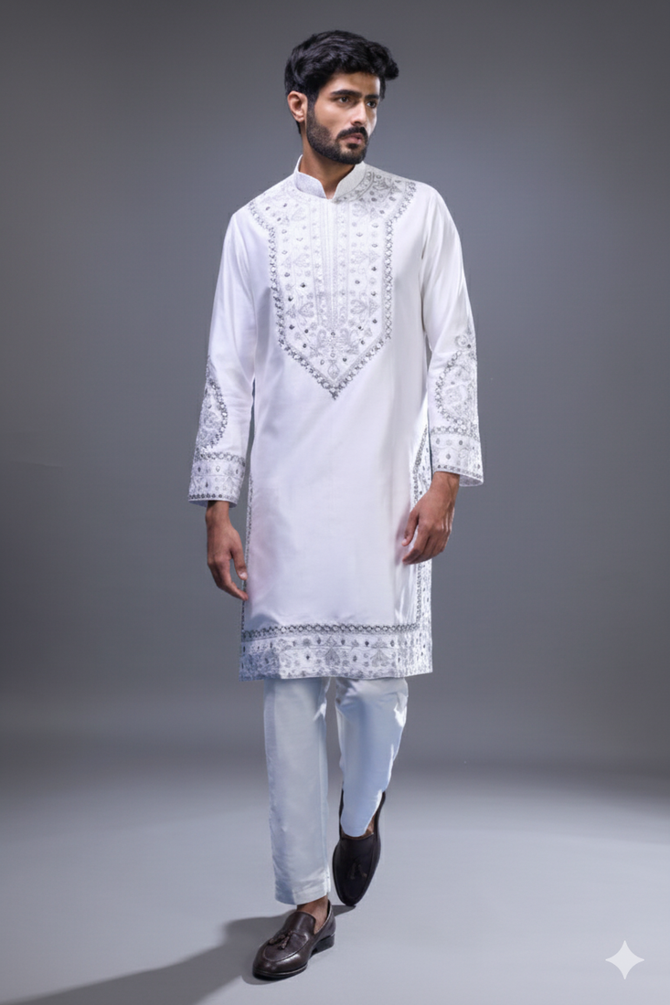 | Product Description | Elevate Your Festive Style With This Elegant Off White Silk Kurta Pant Set For Men, Designed With Refined Embroidery And Subtle Mirror Accents. The Kurta Features Intricate Detailing Along The Front Panel, Cuffs, And Hem, Creating A Balanced Blend Of Tradition And Modern Sophistication. The Soft Silk Fabric Offers A Smooth Texture With A Graceful Sheen, Making It Perfect For Special Occasions. Paired With A Tailored Pant, It Delivers A Clean And Polished Silhouette For Effortless Styling. The Neutral Off White Tone Enhances Its Versatility, Making It Suitable For Weddings, Festive Gatherings, And Cultural Celebrations. Ideal For Men Who Appreciate Understated Elegance With Detailed Craftsmanship, This Outfit Ensures A Timeless And Sophisticated Ethnic Look. |