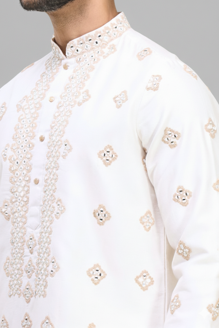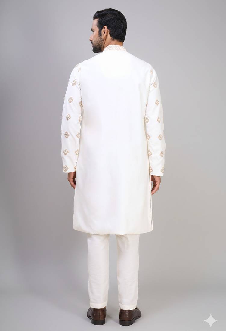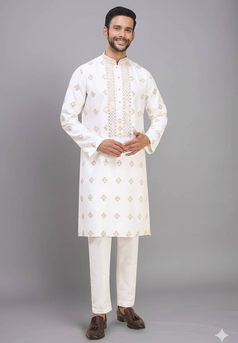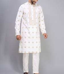 men’s off white silk kurta pant with full embroidery