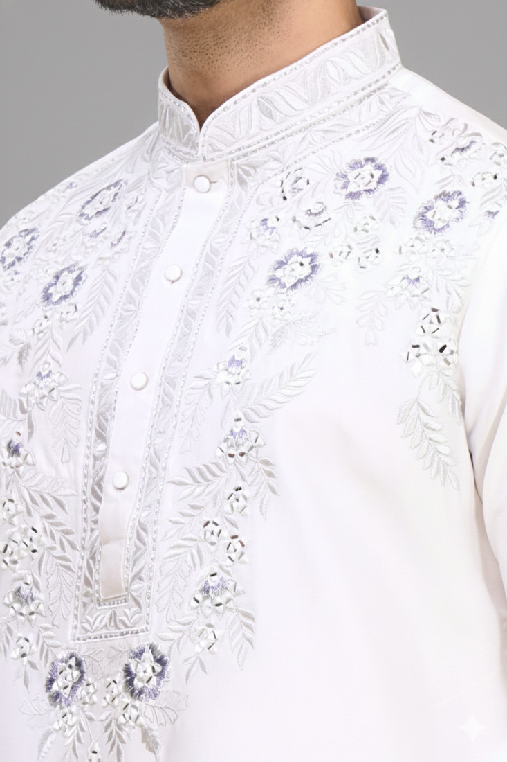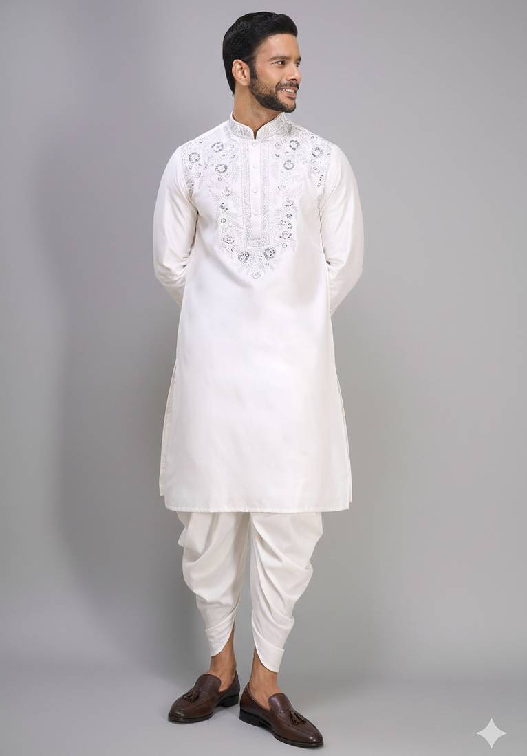 | Product Description | Clean, Elegant, And Effortlessly Festive This Off White Silk Kurta Set Is All About Subtle Sophistication. The Tonal Thread Embroidery Across The Chest And Cuffs Adds Depth Without Overpowering The Look, Making It Perfect For Daytime Weddings Or Refined Celebrations. Crafted In Smooth Silk, It Offers A Soft Sheen That Enhances Its Minimal Yet Premium Appeal. The Straight Silhouette With A Mandarin Collar Keeps It Classic, While The Patiala Bottom Brings In Comfort And Traditional Volume. This Is The Kind Of Outfit That Works When You Want To Look Polished Without Going Too Heavy. Pair It With Tan Or Brown Footwear For A Balanced, Graceful Finish That Feels Both Modern And Timeless. |