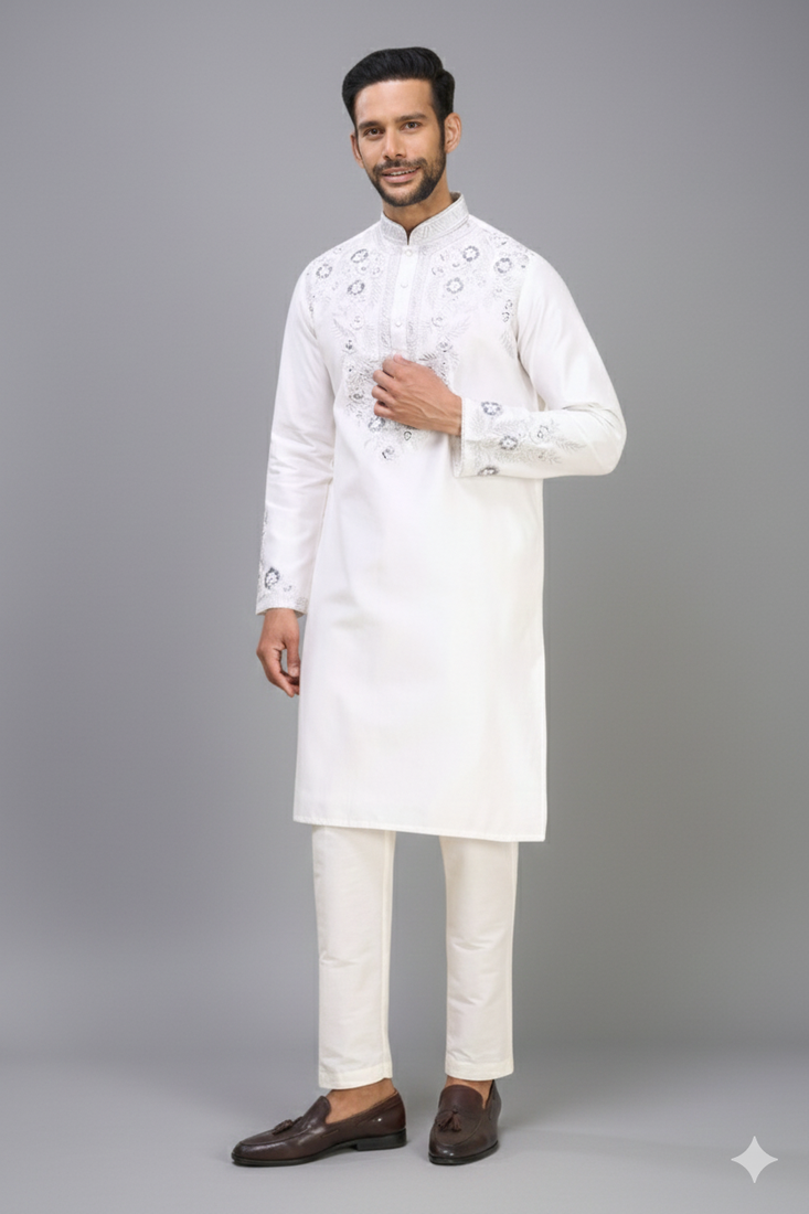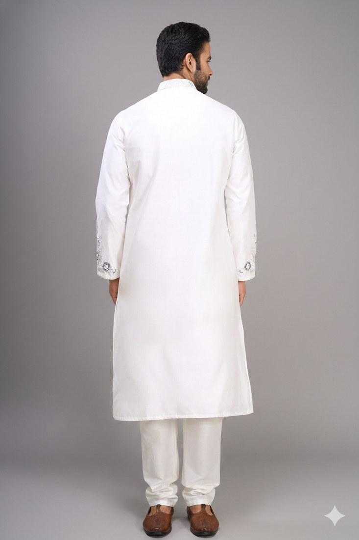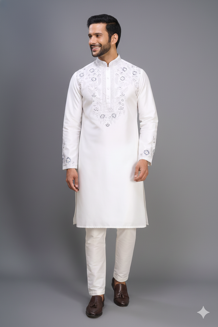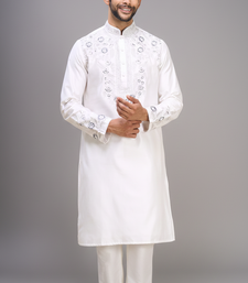 | Product Name | White Silk Embroidered Mirror Work Kurta Pant Set For Men | |
